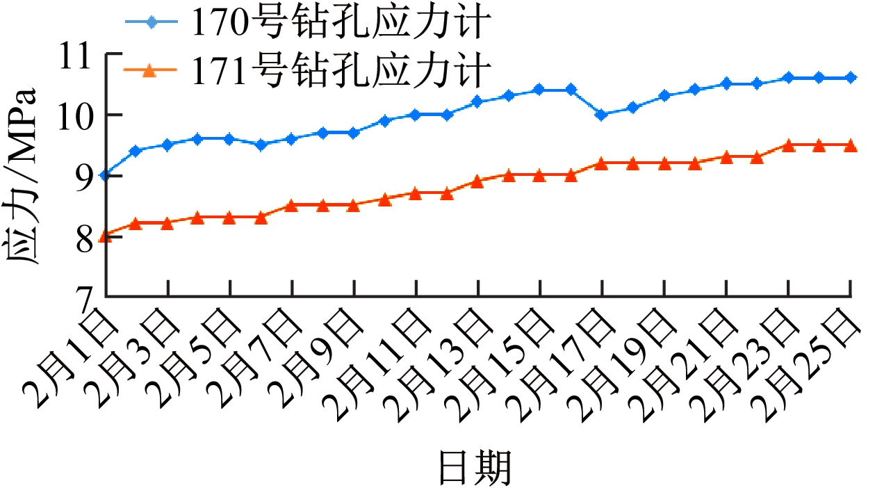 40309工作面回采末期,在靠近联络巷、硐室及中央大巷区域布置2个钻孔应力计(编号为170,171)。随着工作面回采,2个钻孔应力计监测值呈逐渐增大趋势,如图6所示。可看出170号钻孔应力计监测值由9 MPa增大至10.7 MPa,应力集中系数达2.37;171号钻孔应力计监测值由8 MPa增大至9.6 MPa,应力集中系数达2.13。这表明在工作面回采末期,工作面外围联络巷、硐室及中央大巷区域受采动影响,应力水平持续升高。