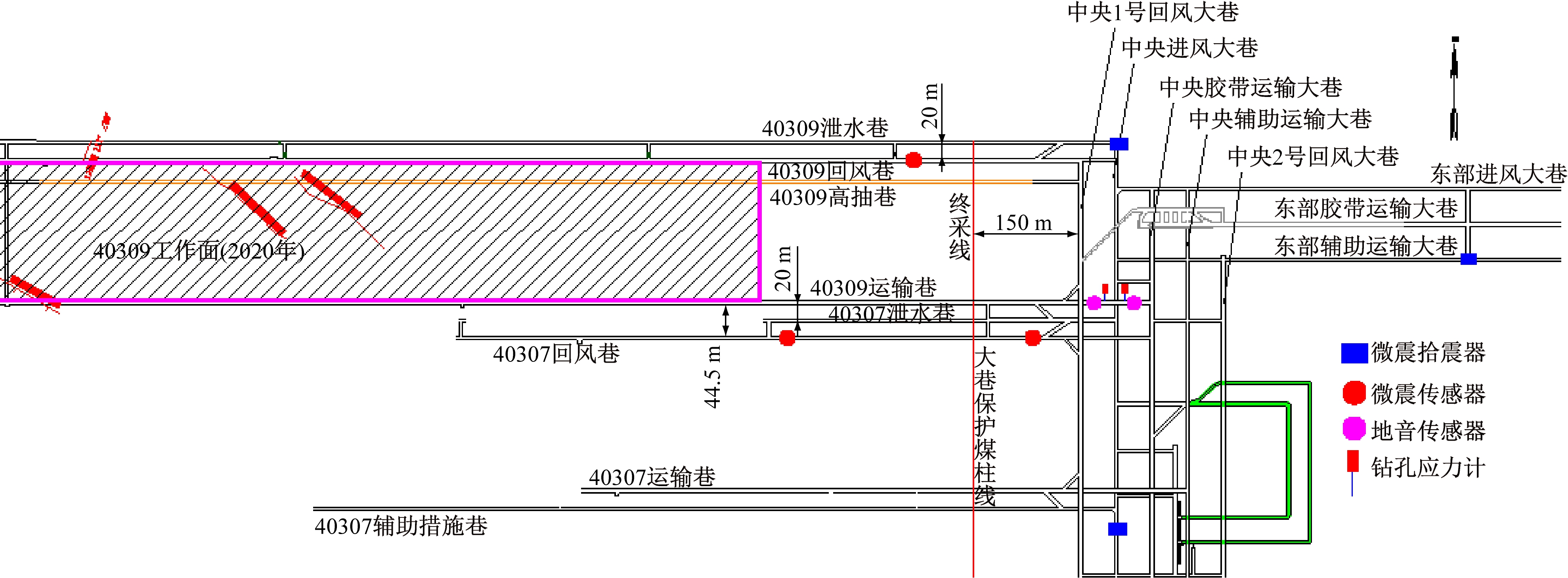 (2) 结合40309工作面回采末期地质及开采技术条件对冲击地压影响因素进行分析,确定煤层上覆厚硬顶板及巷道集中布置等为工作面回采末期冲击地压主要影响因素,工作面外围联络巷、硐室及中央大巷等巷道布置集中区域为主要冲击危险区。