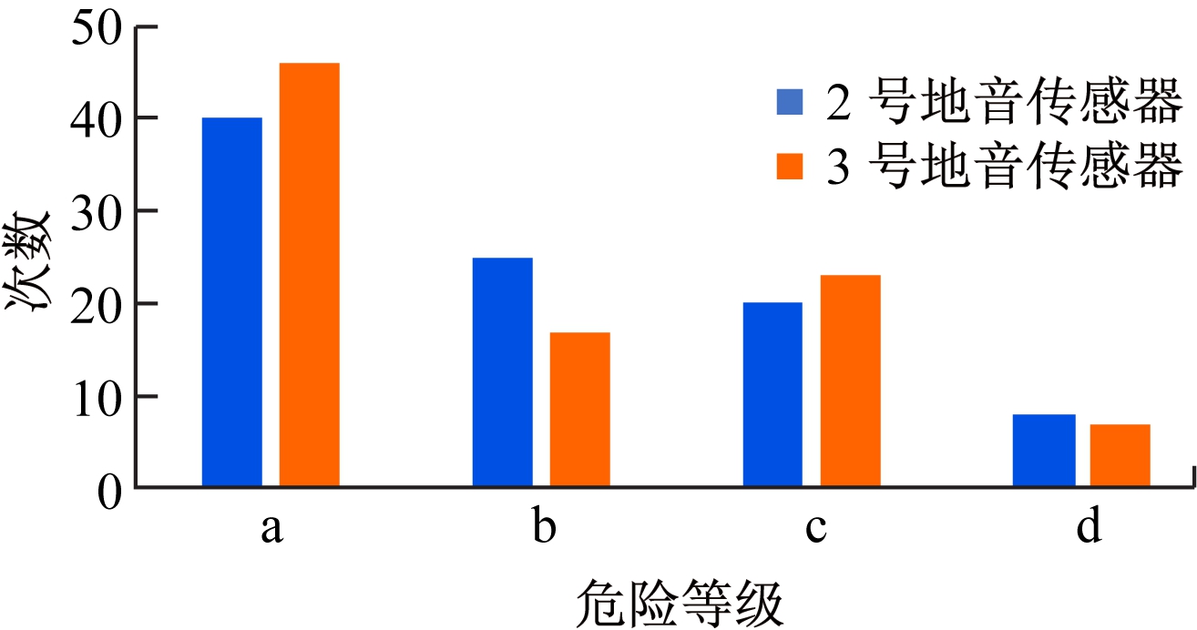 在40309工作面靠近联络巷、硐室及中央大巷区域布置2个地音传感器(编号为2,3)。在工作面回采末期,2个地音传感器监测能量、频次较正常回采期间均上升,地音监测危险等级分布如图5所示。可看出a—d级分别有86,42,43,15次。a级和b级次数占总评价班次的68.8%,c级和d级次数占31.2%。与工作面正常回采期间相比,c级和d级占比增加24.7%,表明在工作面回采末期,联络巷、硐室及中央大巷区域的冲击危险性升高。