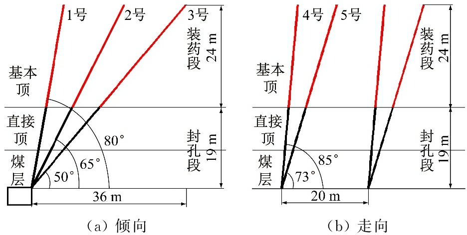 钻孔号孔深/m仰角/(°)方位角/(°)孔径/mm装药段长度/m封孔段长度/m间距/m144800752420202486507526222035650075312520443859075241920546739075252120