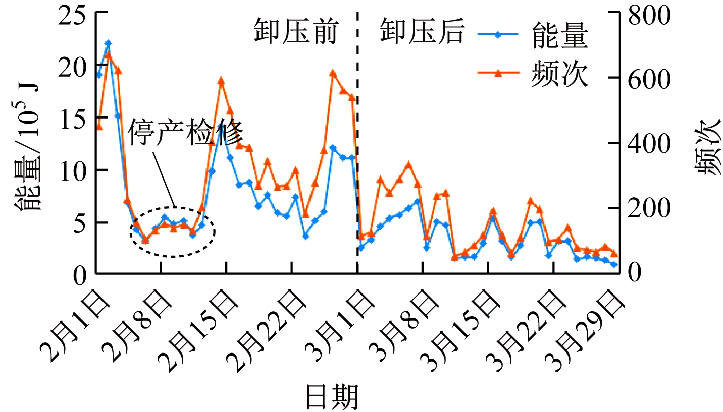 Fig.12 Microseismic frequency and energy distribution before and after adopting the anti-burst and pressure relief scheme