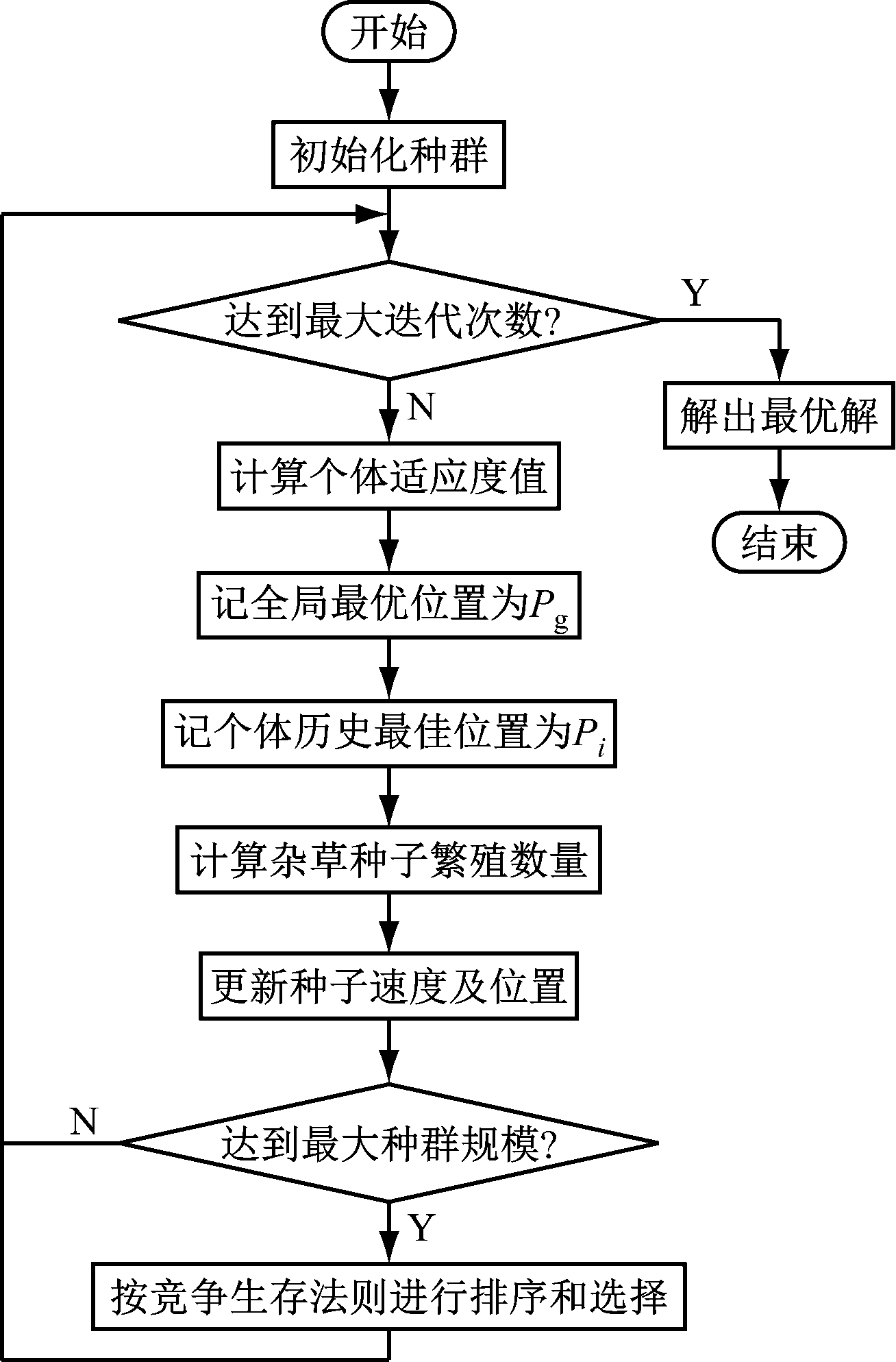 混合IWO-PSO算法流程如图3所示。在生成随机群体并初始化群体数量后进入迭代寻优过程,在每次迭代过程中,计算个体适应度值和种群适应度极限值,记录全局最优位置,同时与各个体历史位置对比,更新个体历史最佳位置;根据适应度值计算个体可繁殖种子数量,同时更新各种子的速度及位置,将生成的种子在寻优范围内随机分布,并在父代植物周围正态分布;经多次进化后,将当前种群规模与种群规模极限值对比,若已超过种群规模极限值,以适应程度为判定标准对全部个体进行排序,排除不满足适应标准的个体,保留剩余个体。种子的速度及位置更新公式分别为