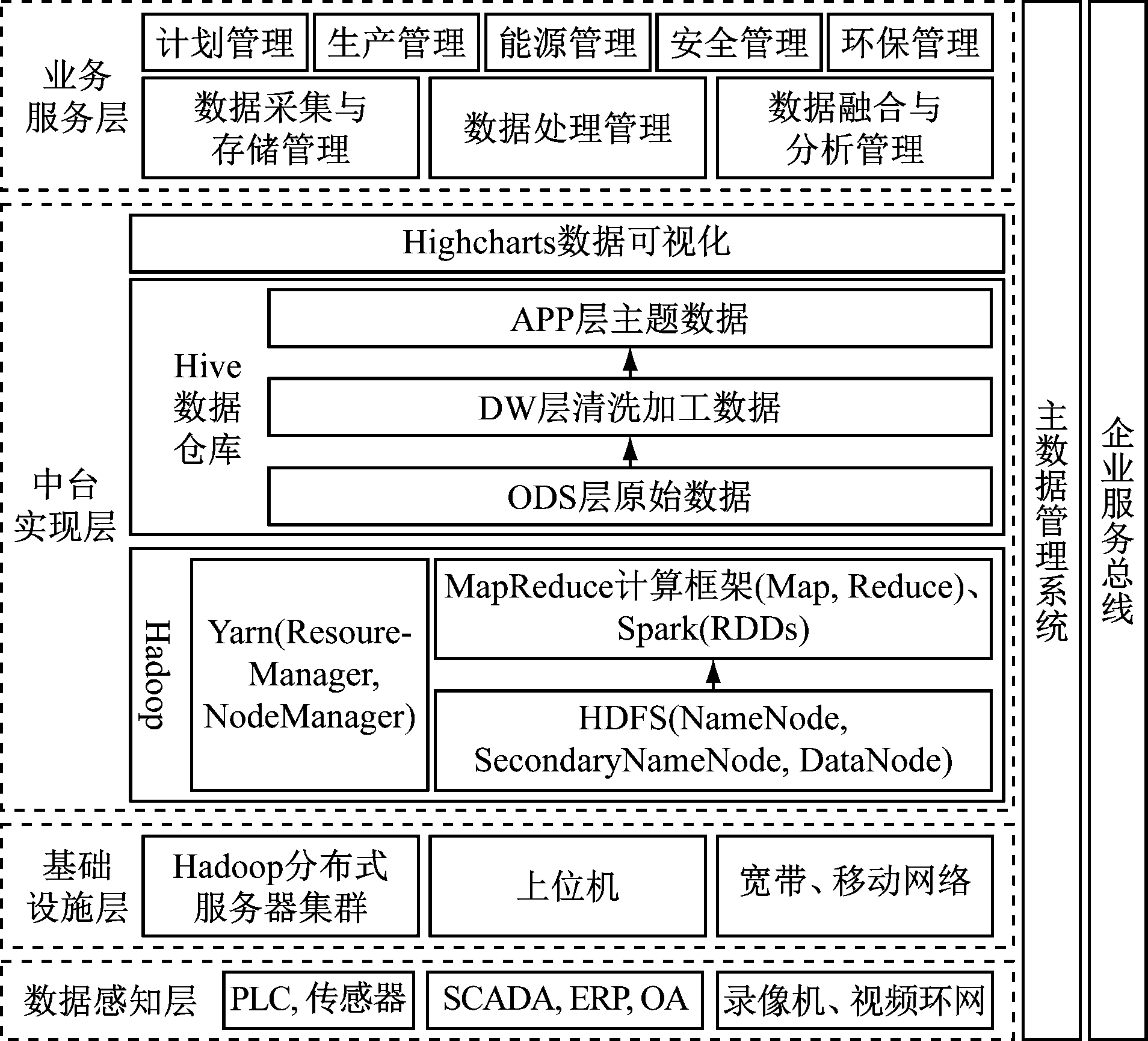 面对TB级别、彼此孤立存在的海量多源异构数据,数据中台通过Hadoop生态圈技术实现数据感知、集成、处理、融合、分析、可视化展示的全生命周期管理。