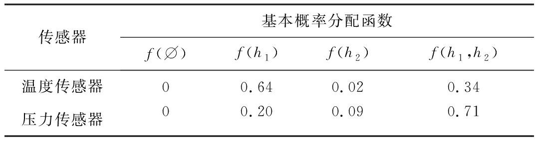 传感器基本概率分配函数f(⌀)f(h1)f(h2)f(h1,h2)温度传感器00.640.020.34压力传感器00.200.090.71