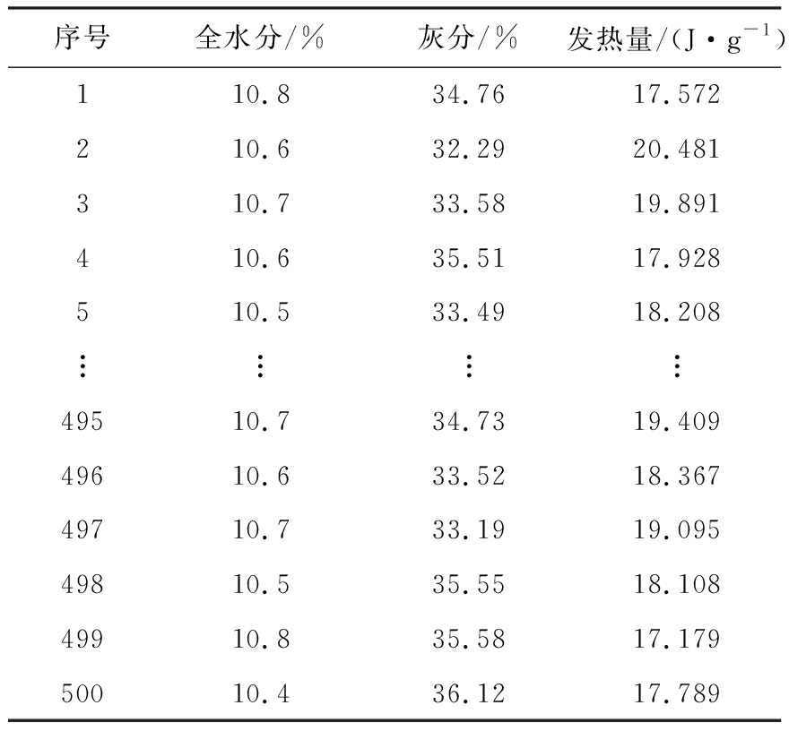 序号全水分/%灰分/%发热量/(J·g-1)110.834.7617.572210.632.2920.481310.733.5819.891410.635.5117.928510.533.4918.208︙︙︙︙49510.734.7319.40949610.633.5218.36749710.733.1919.09549810.535.5518.10849910.835.5817.17950010.436.1217.789