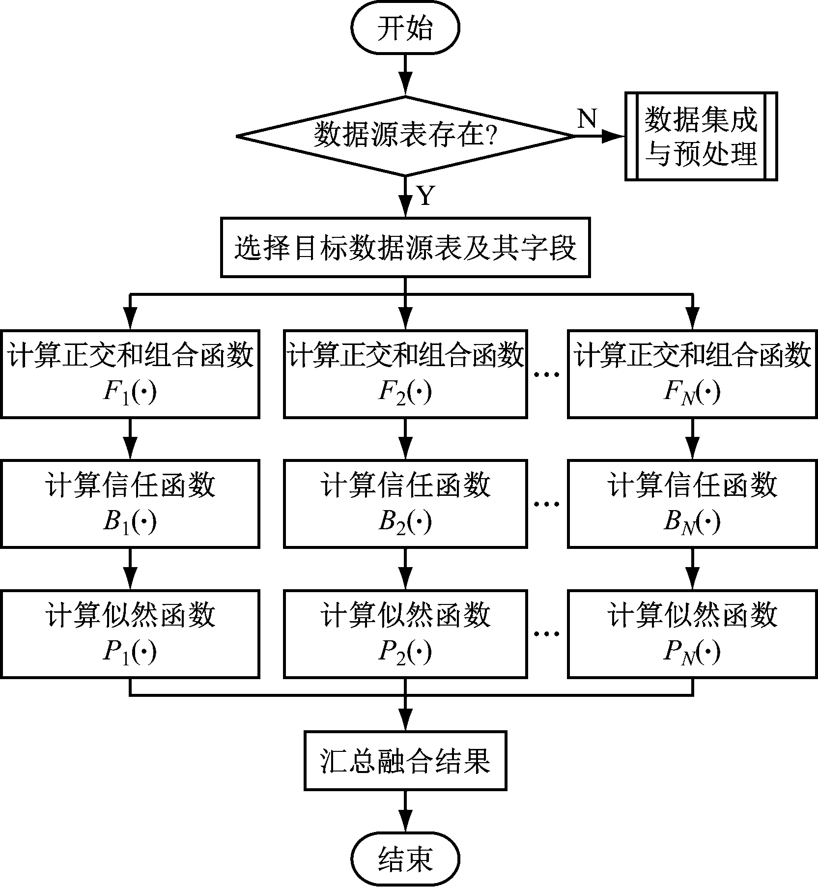 针对选煤厂海量数据融合的需求,结合经典D-S证据理论[14-15]、Hadoop和Hive数据仓库,设计了多源异构数据融合子系统。D-S证据理论运用Dempster合成准则和信度函数描述按时序获得的要素间相互关系。数据融合流程如图4所示,其中FN(·),BN(·),PN(·)分别为MapReduce将大规模计算任务拆分成N个子任务的正交和组合函数、信任函数、似然函数。