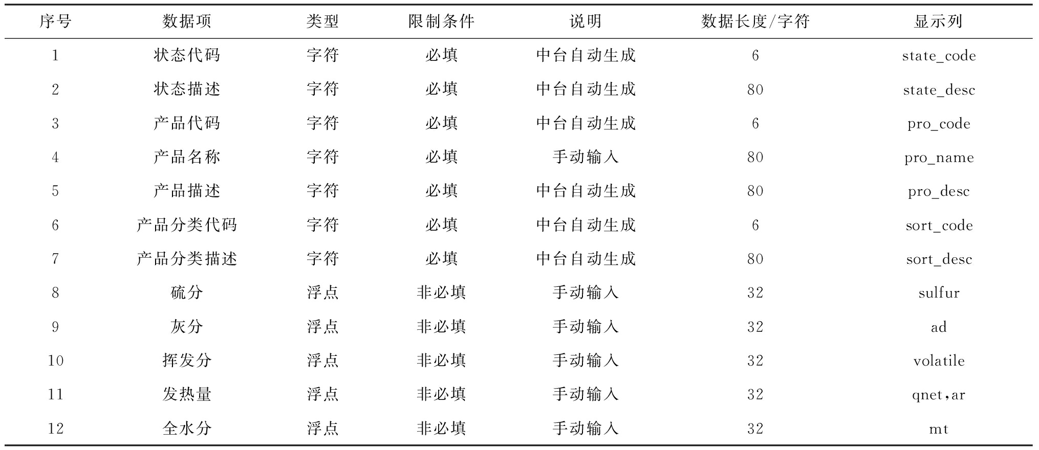 序号数据项类型限制条件说明数据长度/字符显示列1状态代码字符必填中台自动生成6state_code2状态描述字符必填中台自动生成80state_desc3产品代码字符必填中台自动生成6pro_code4产品名称字符必填手动输入80pro_name5产品描述字符必填中台自动生成80pro_desc6产品分类代码字符必填中台自动生成6sort_code7产品分类描述字符必填中台自动生成80sort_desc8硫分浮点非必填手动输入32sulfur9灰分浮点非必填手动输入32ad10挥发分浮点非必填手动输入32volatile11发热量浮点非必填手动输入32qnet,ar12全水分浮点非必填手动输入32mt