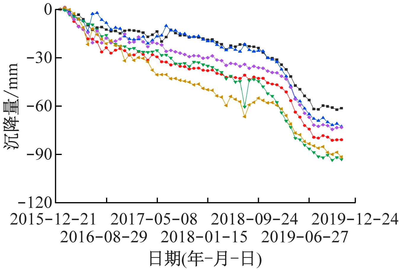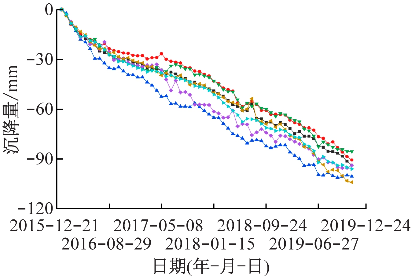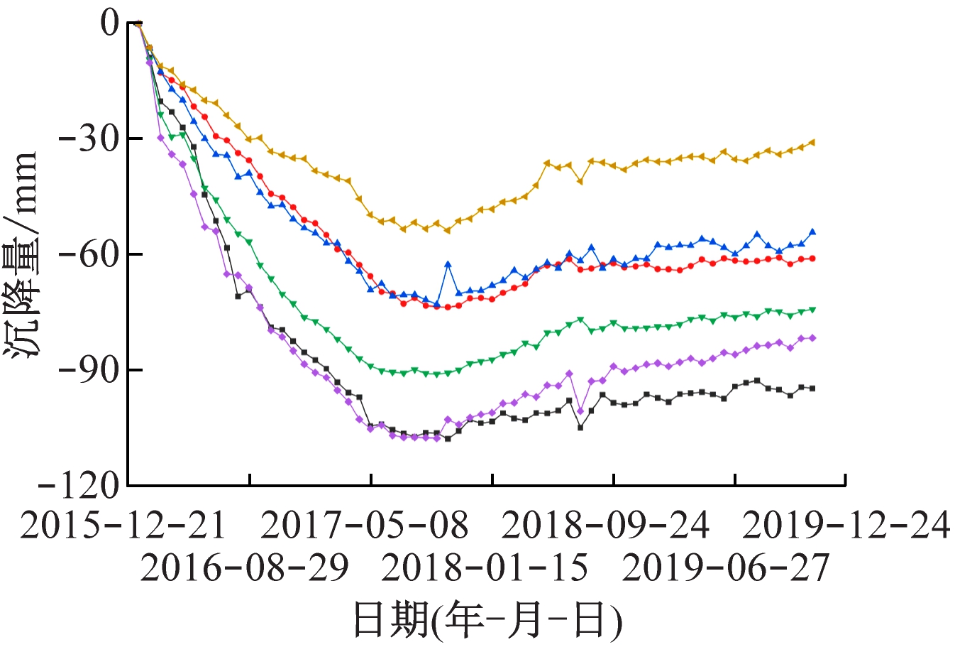 为了进一步研究矿区沉降规律,在每个矿区已停采的工作面周围提取部分沉降点(位置如图1所示)进行时间序列分析,结果如图5所示。由图5可知:夹河矿在2015-12-21—2017-05-08期间,各点均出现明显下沉现象,最大沉降量可达-105 mm;2017-05-08—2017-10-11期间,地表整体沉降表现平缓;在2017-10-11后,所选点均出现缓慢抬升现象,出现这一现象的原因可能是由于地下水上升,造成土地回弹。张小楼矿在2015-12-21—2019-08-14期间下沉明显,最大沉降量可达-97 mm,2019-08-14后下沉趋势减缓。庞庄矿在2015-12-21—2019-07-21期间,所选点皆呈现出下沉趋势,最大沉降量为-88 mm,此后逐渐趋于稳定。