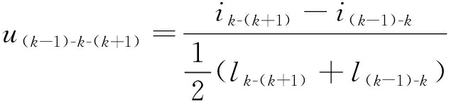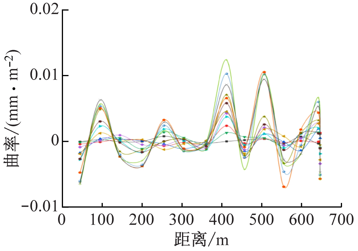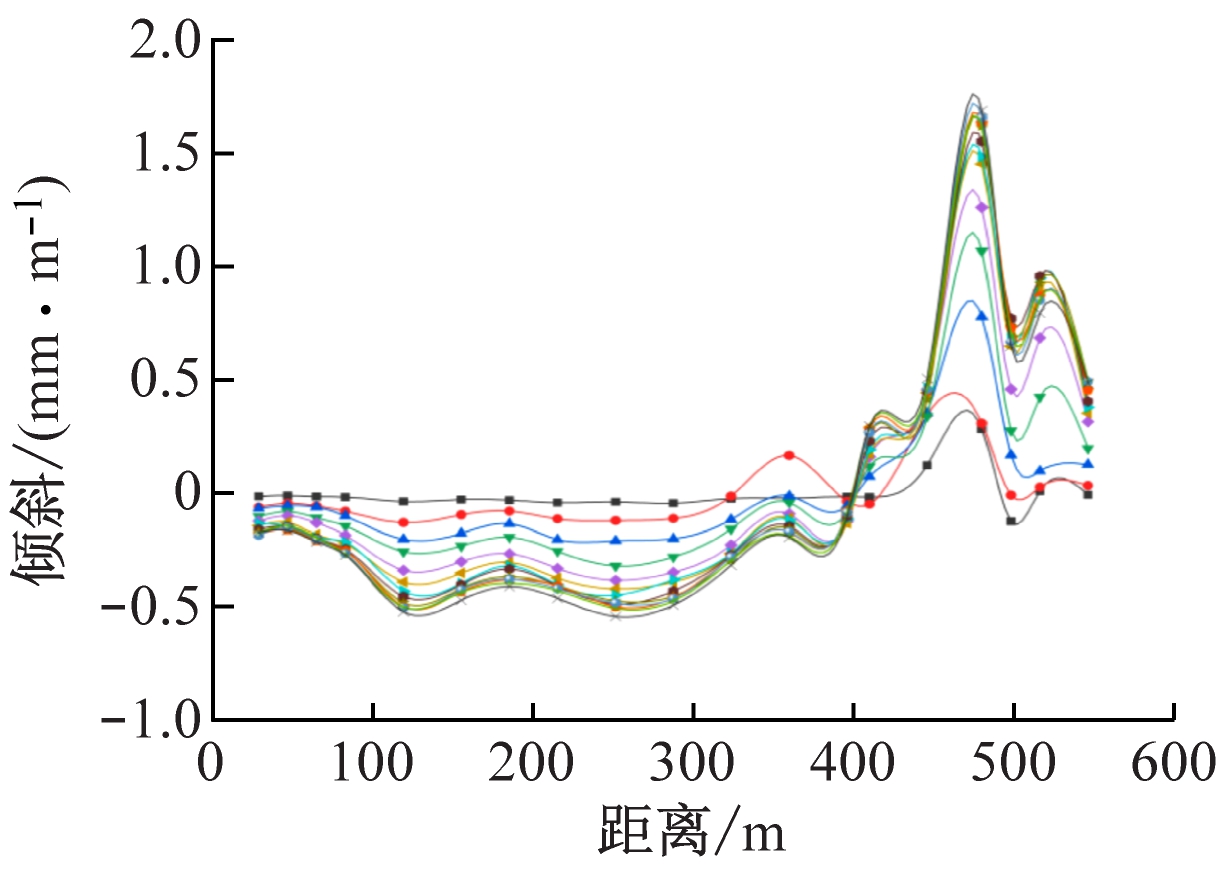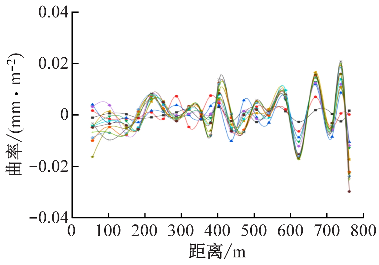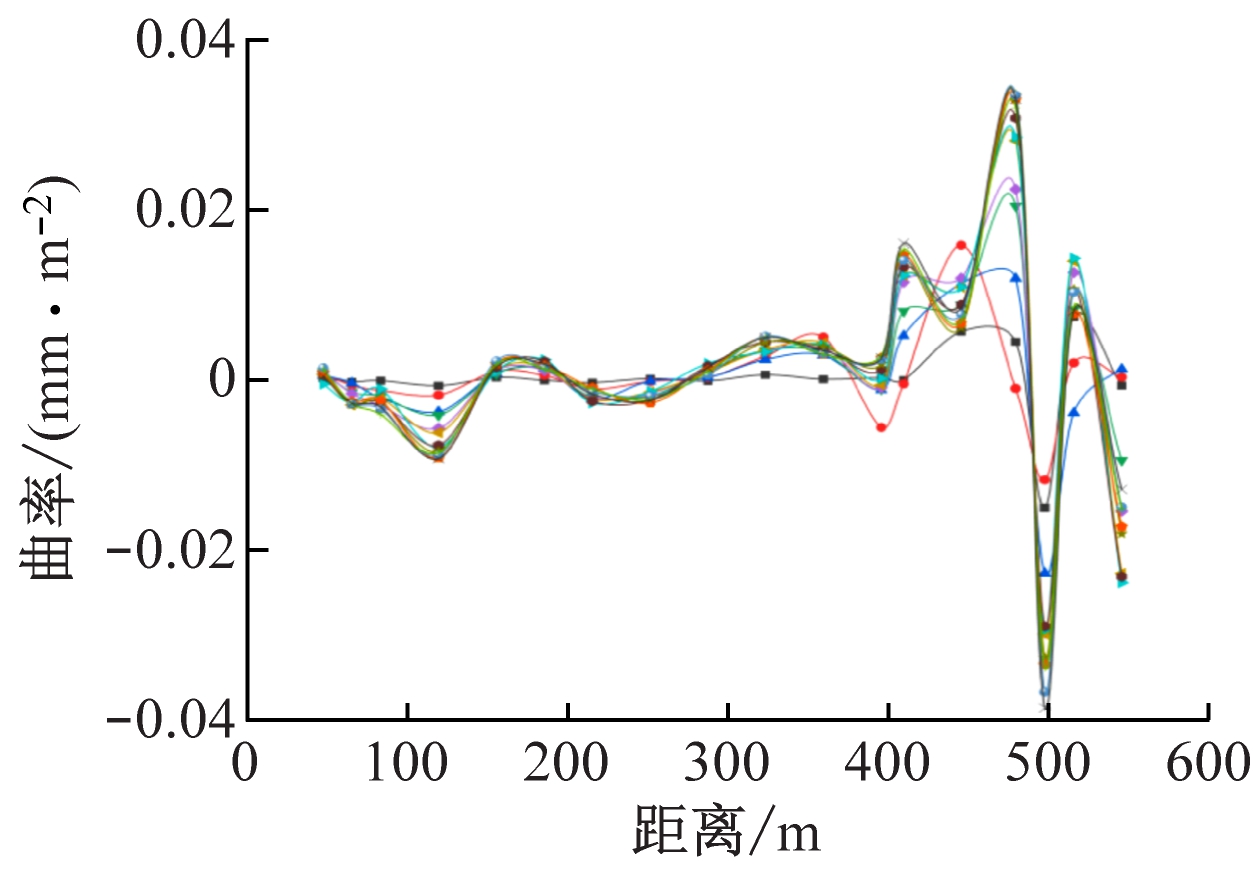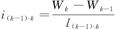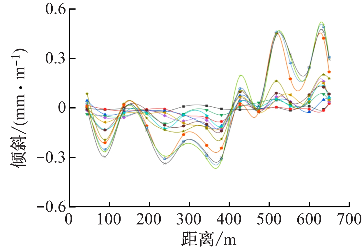 式中:i(k-1)-k为观测点k-1和k之间的倾斜,mm/m;Wk-1,Wk为观测点k-1和k的沉降量,mm;l(k-1)-k为观测点k-1和k之间的水平距离,m;u(k-1)-k-(k+1)为点k-1,k和k+1之间的曲率,mm/m2。