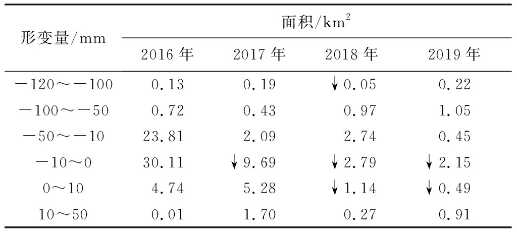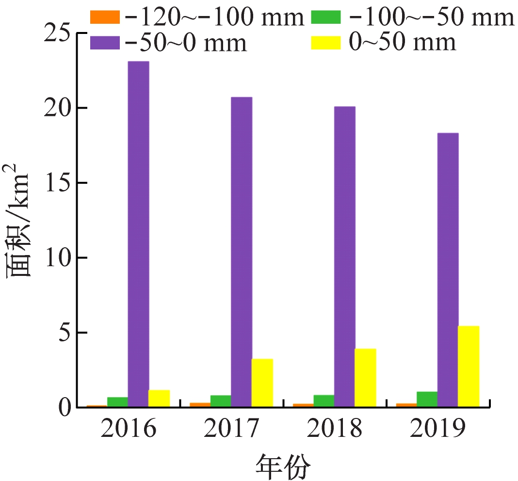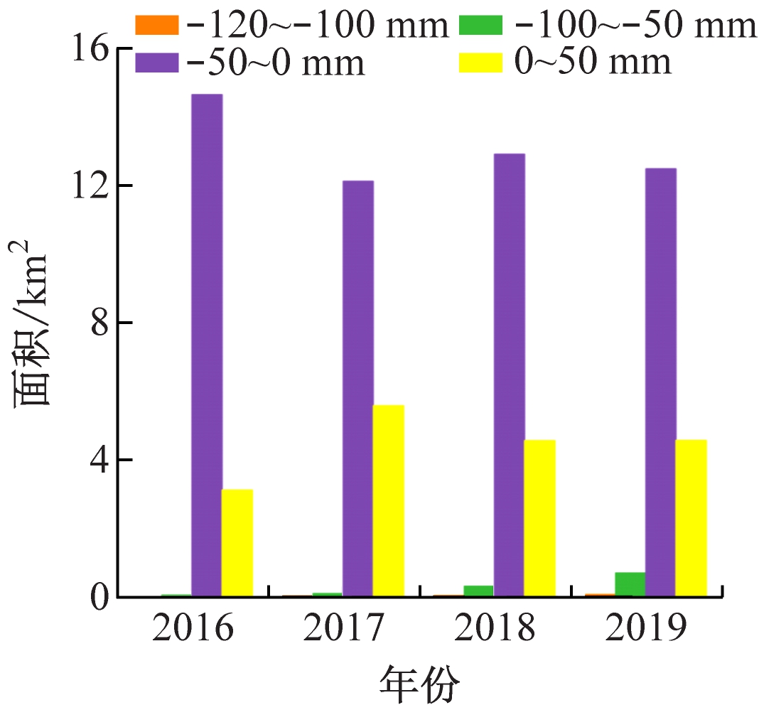 形变量/mm面积/km22016年2017年2018年2019年-120~-1000.130.19↓0.050.22-100~-500.720.430.971.05-50~-1023.812.092.74 0.45 -10~030.11↓9.69↓2.79↓2.150~104.745.28↓1.14↓0.4910~500.011.700.270.91