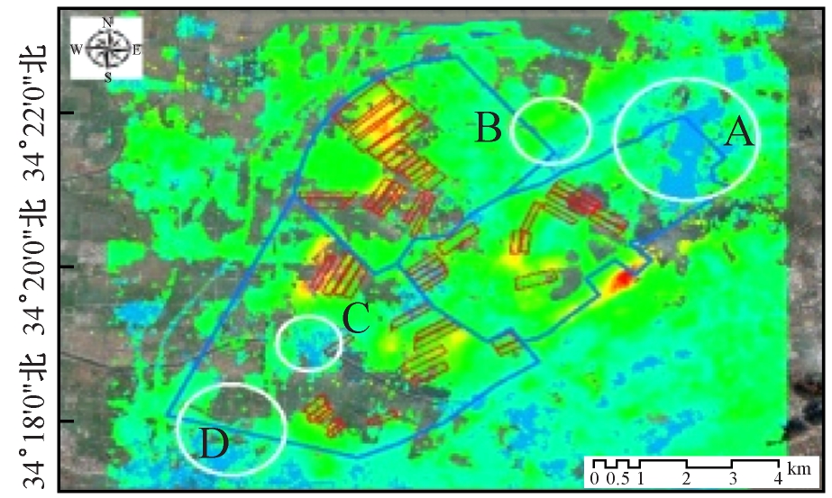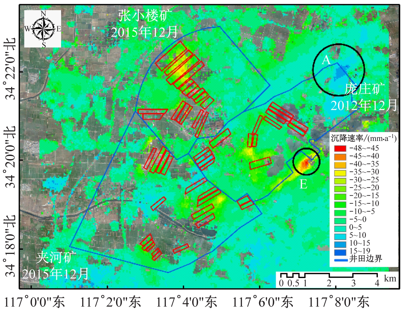 从图3可知:研究区大部分地表呈下降趋势;庞庄矿东南部E区域由于开采结束不久,地表沉降速率较大,可达-48 mm/a;夹河矿和张小楼矿的最大沉降速率分别为-25.8,-29.6 mm/a;庞庄矿东北部A区域(黑色圆圈范围内)出现抬升,抬升速率达11.3 mm/a。