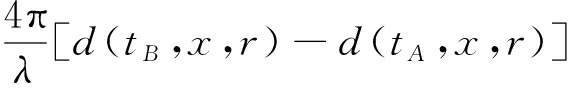 式中:Ø[tA,x,r],Ø[tB,x,r]分别为tA,tB时刻相对于初始时刻t0的形变相位,x,r分别为方位向与距离向坐标;λ为雷达波长;d(tA,x,r)和d(tB,x,r)为相对于初始时刻的视线方向(Line of Sight, LOS)的形变量。