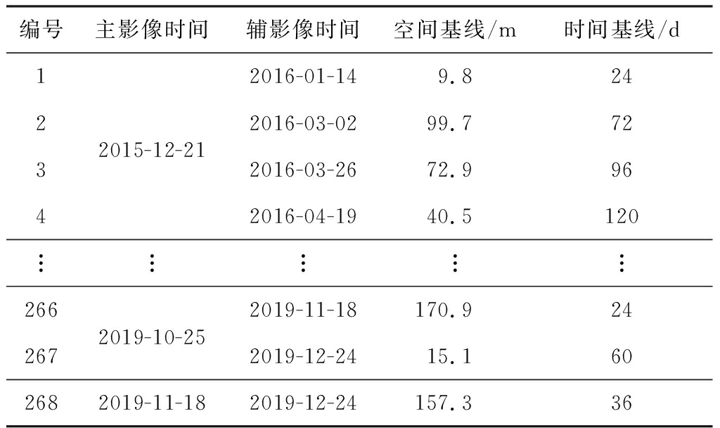 编号主影像时间辅影像时间空间基线/m时间基线/d12016-01-149.82422016-03-0299.77232015-12-212016-03-2672.99642016-04-1940.5120︙︙︙︙︙2662019-11-18170.9242672019-10-252019-12-2415.1602682019-11-182019-12-24157.336