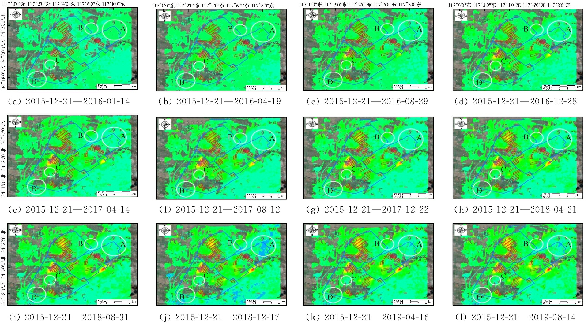 为进一步分析关闭矿井后各矿区地表时空形变规律,在获取沉降速率的基础上对其进行时间维度上的积分,获取各矿区时间序列累计沉降量的变化,结果如图4所示。因篇幅所限,将时间间隔调整为4个月。由图4可知:在闭矿1 a后,即2015-12-21—2016-12-27期间,夹河矿已经出现明显的下沉趋势,最大沉降量可达-126 mm;庞庄矿东南侧受拾屯矿开采影响也出现了下沉,最大沉降量可达-110 mm。2016-12-27—2018-12-17期间,庞庄矿、夹河矿、张小楼矿3个矿区大部分区域均出现明显的下沉现象,下沉影响范围进一步扩大,最大沉降量为-154 mm。此外,图4中的A、B、C、D区域出现了抬升现象,庞庄矿A区域最大抬升值达47 mm。至2019-12-24,张小楼矿与庞庄矿中部沉降区域范围继续变大,夹河矿与庞庄矿东南侧下沉范围趋于稳定,但沉降量还在继续变大,说明地表下沉还未停止,将继续下沉。