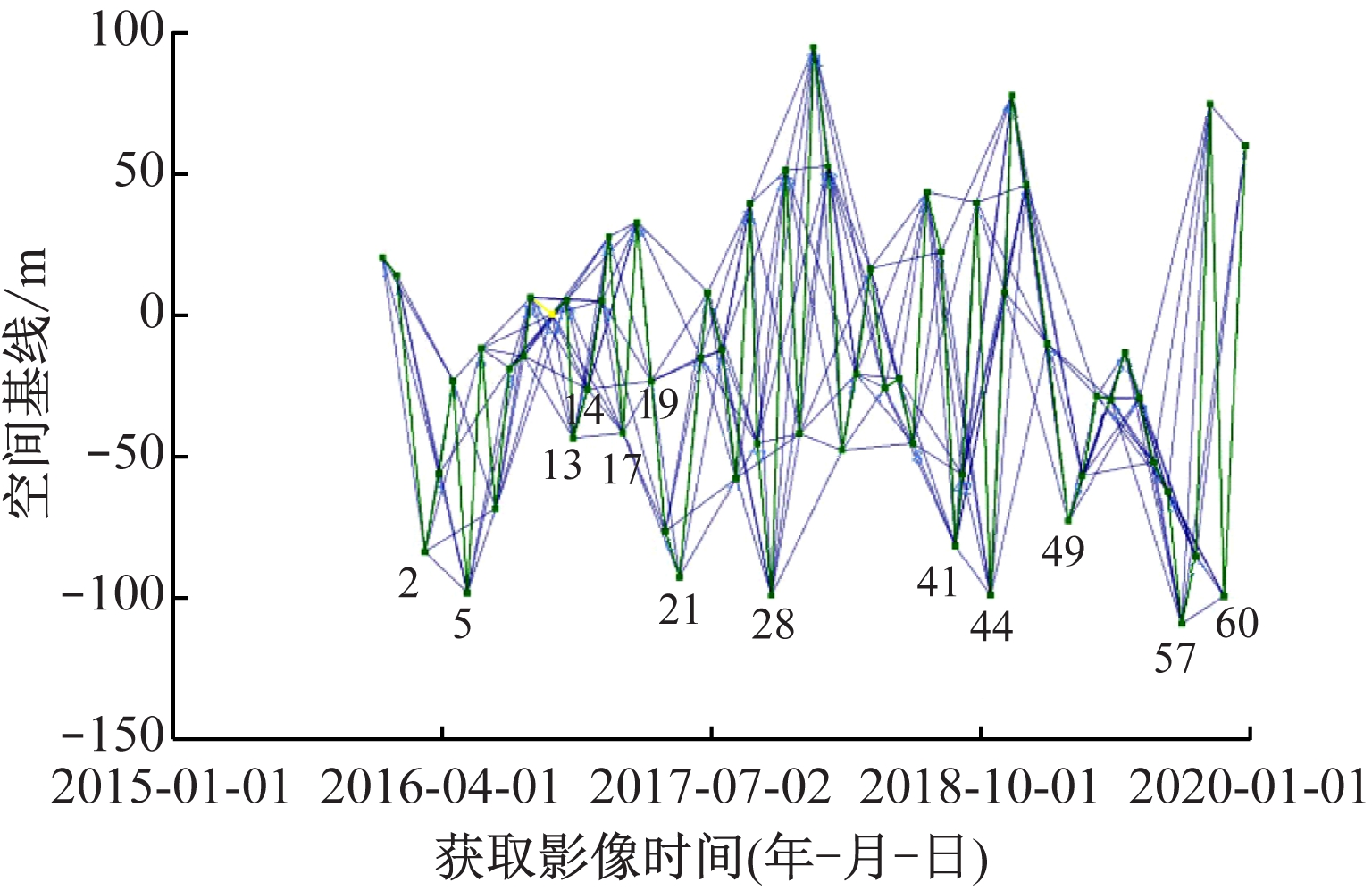 共收集了62景Sentinel-1A IW模式的SAR卫星影像,时间跨度为2015-12-21—2019-12-24。SAR影像方位向分辨率为5 m,距离向分辨率为20 m。影像除2017-05-08—2017-06-13、2018-12-27—2019-02-27、2019-11-18—2019-12-24间隔为36 d,2016-01-14—2016-03-02间隔为48 d外,其余获取时间间隔均为24 d。公共参考主影像时间为2016-10-04,部分影像获取时间和时空基线信息见表1。采用数字高程模型(DEM)为美国航天局提供的STRM 1数据进行分析,分辨率为30 m。