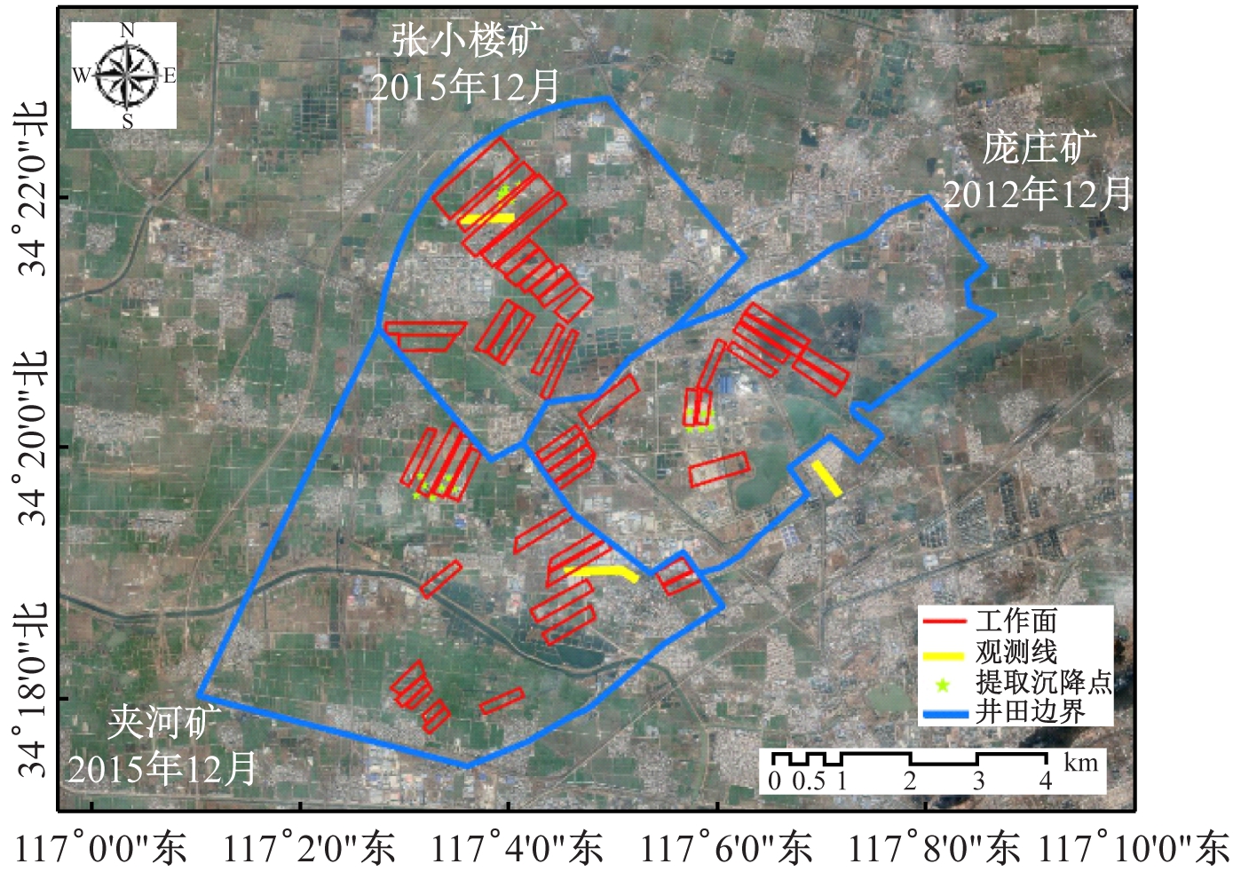 徐州西部矿区位于铜山区与泉山区境内,该区域为旧黄河泛滥形成的冲积平原,地势较为平坦,属南温带鲁淮区,具有长江流域和黄河流域夏季多雨、冬季干寒的过渡性特点。徐州西部矿区内,石炭系、二叠系地层是其含煤地层,在井田内均被第四系冲积层覆盖。整个矿区由张小楼矿、夹河矿、庞庄矿组成。张小楼矿井田东西长约5.0 km,南北宽约3.4 km,于2015年12月闭矿;夹河矿井田东西长约5.5 km,南北宽约4.5 km,于2015年12月闭矿;庞庄矿井田东西长约6.1 km,南北宽3 km,于2012年12月闭矿,总面积约为59.99 km2。夹河矿东南侧边界与拾屯矿接壤。研究区概况如图1所示。