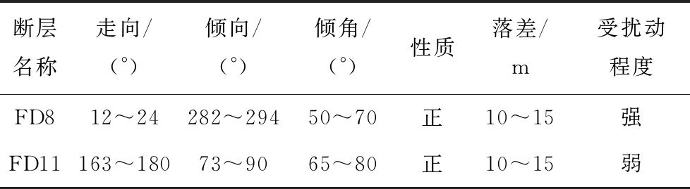 断层名称走向/(°)倾向/(°)倾角/(°)性质落差/m受扰动程度FD812~24282~29450~70正10~15强FD11163~18073~9065~80正10~15弱