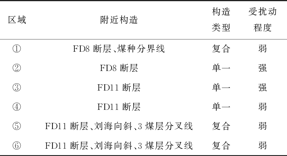 区域附近构造构造类型受扰动程度①FD8断层、煤种分界线复合弱②FD8断层单一强③FD11断层单一强④FD11断层单一弱⑤FD11断层、刘海向斜、3煤层分叉线复合弱⑥FD11断层、刘海向斜、3煤层分叉线复合弱