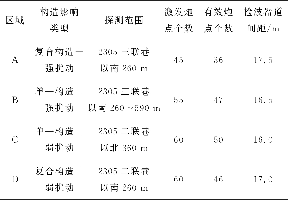 根据探测区域内构造影响类型,将微震事件集中区域②—⑥所在的约1 320 m范围近似均分为A,B,C,D 4个独立探测区域(图2),激发震源和探测系统分别布置在2305下平巷和2305上平巷,各区域探测方案见表3。探测期间工作面处于停产状态,且附近无采掘作业,可认为工作面煤岩体应力分布无大幅改变。
