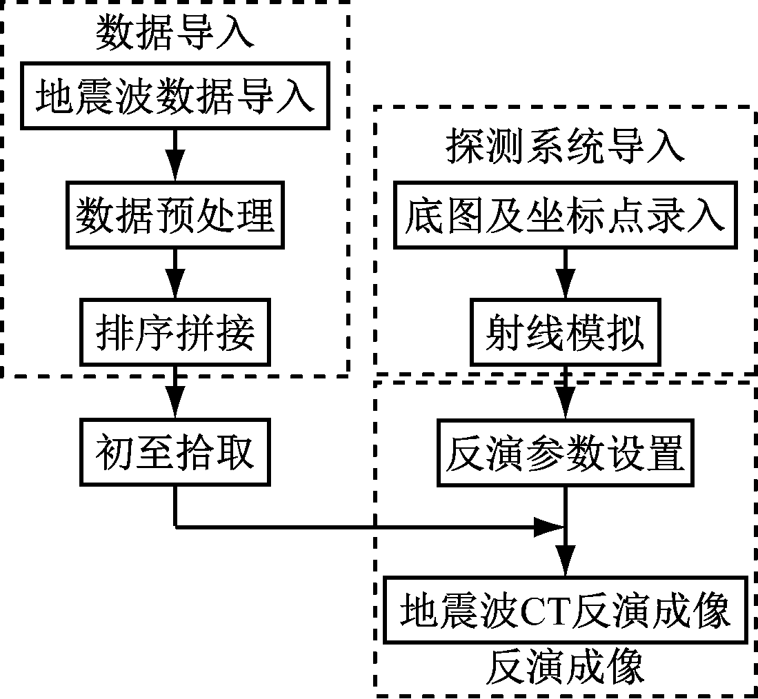采用探测系统配套的PASAT-RHA软件进行数据处理,流程如图3所示。① 数据导入:将采集的地震波数据导入PASAT-RHA软件,根据现场情况和可视化波形图像剔除无效及初至模糊的地震波数据,按时间顺序将有效数据依次拼接。② 探测系统导入:录入有效数据对应的探测系统坐标,进行震源激发点射线模拟。③ 初至拾取:结合频谱分析和数字滤波自动拾取初至,人工修正后确定每道数据的初至时间。④ 反演成像:设定离散像元尺寸、背景速度、边界条件等反演参数,按照算法反演成像。