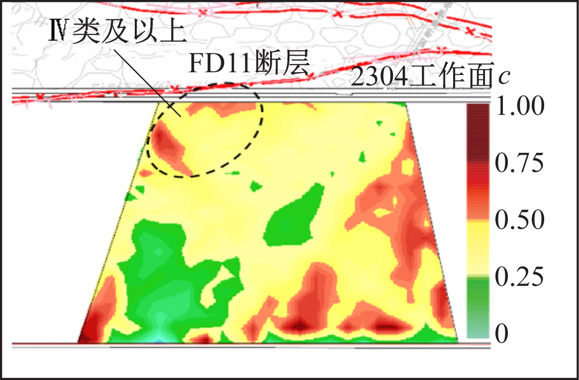 B区域应力分布仅受FD11断层单一构造影响,局部断层受扰动程度较强,但低于FD8断层。B区域特征指数c分布如图6所示。Ⅱ类及以上应力增高区主要位于工作面内部和下平巷区域。上平巷区域以Ⅲ类应力增高区为主,分布较均匀,仅存在小面积的Ⅱ类及以上应力增高区。