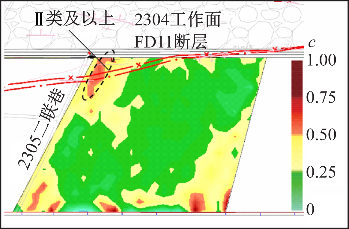 C区域属于单一构造和弱扰动影响区域,区域内部分FD11断层切割上平巷,减弱了侧向采空区悬顶的影响,对周围煤岩体产生一定卸压作用。C区域特征指数c分布如图7所示。该区域高水平应力集中程度在整个探测区域内最弱,仅存在1处小面积Ⅱ类应力增高区,位于二联巷与上平巷交叉处。