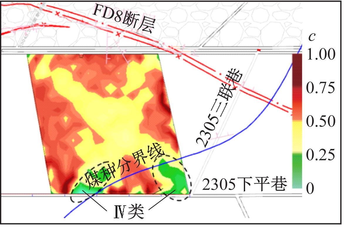 A区域应力分布受FD8断层和煤种分界线复合构造影响,其中FD8断层受扰动程度较强,断层周围岩体稳定性较差。A区域特征指数c分布如图5所示。该区域整体应力增高程度在整个探测区域内最大,Ⅱ类及以上应力增高区占比过半,仅存在2处小范围Ⅳ类应力增高区。靠近FD8断层的高水平应力集中区与断层走向近似平行,且分布范围较广;煤种分界线两侧应力分布变化较大,但附近应力增高区面积较小,表明A区域内处于强扰动条件下的FD8断层为导致煤岩体高水平应力集中的主要因素。