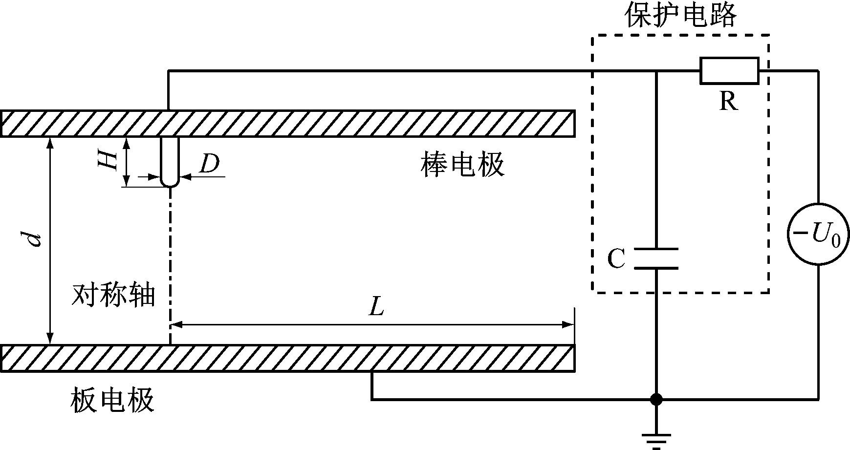 仿真模型如图2所示,该仿真模型主要由板电极、棒电极及保护电路构成。棒电极每根纳米管的放电过程基本一致[17],因此采用单管模型进行仿真。其中纳米管的长度H=10 μm,直径D=0.1 μm,极间距d=50 μm,电极半径L=150 μm,外加电压为U0,电阻R=1 000 Ω,电容C=1 pF。由于研究环境为常温常压,所以,将环境温度设置为293.1 K,压强设置为101.3 kPa。
