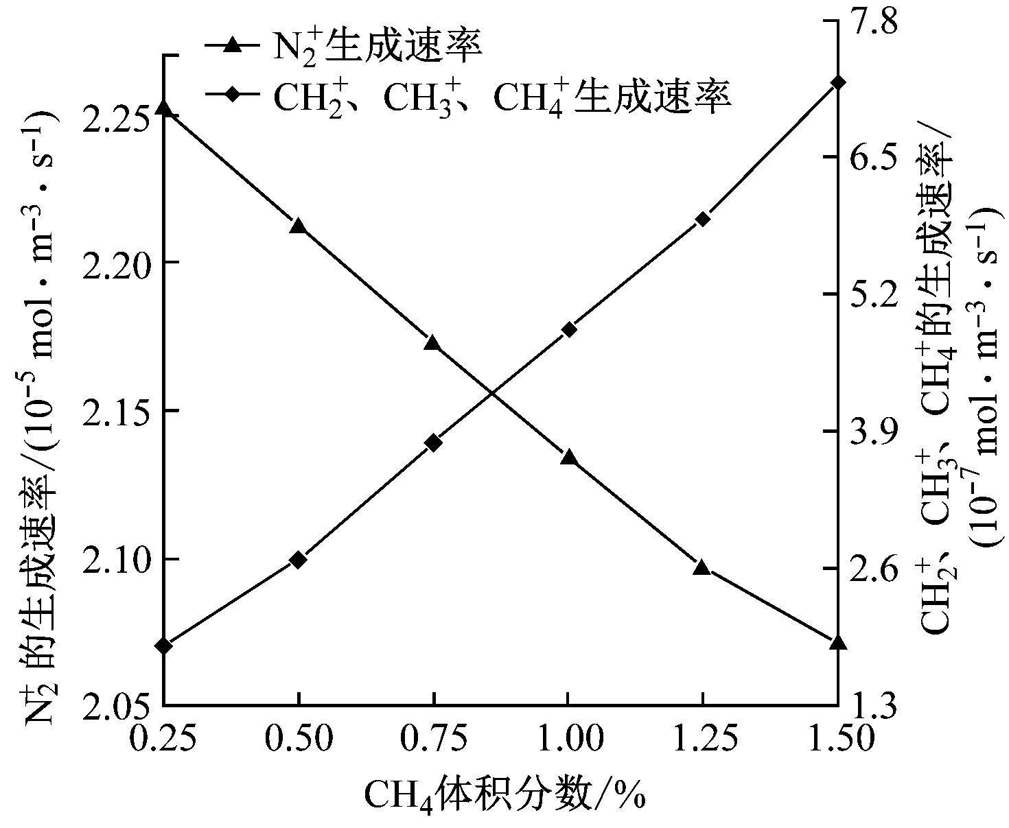 的生成速率不断增大;而由于N2的激发态被CH4所消耗,进而使得彭宁电离速率减小,即