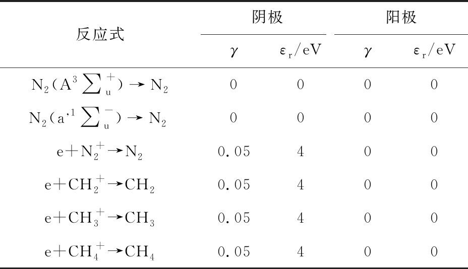 反应式阴极阳极γεr/eVγεr/eVN2(A3∑+u)→N20000N2(a,1∑-u)→N20000e+N+2→N20.05400e+CH+2→CH20.05400e+CH+3→CH30.05400e+CH+4→CH40.05400