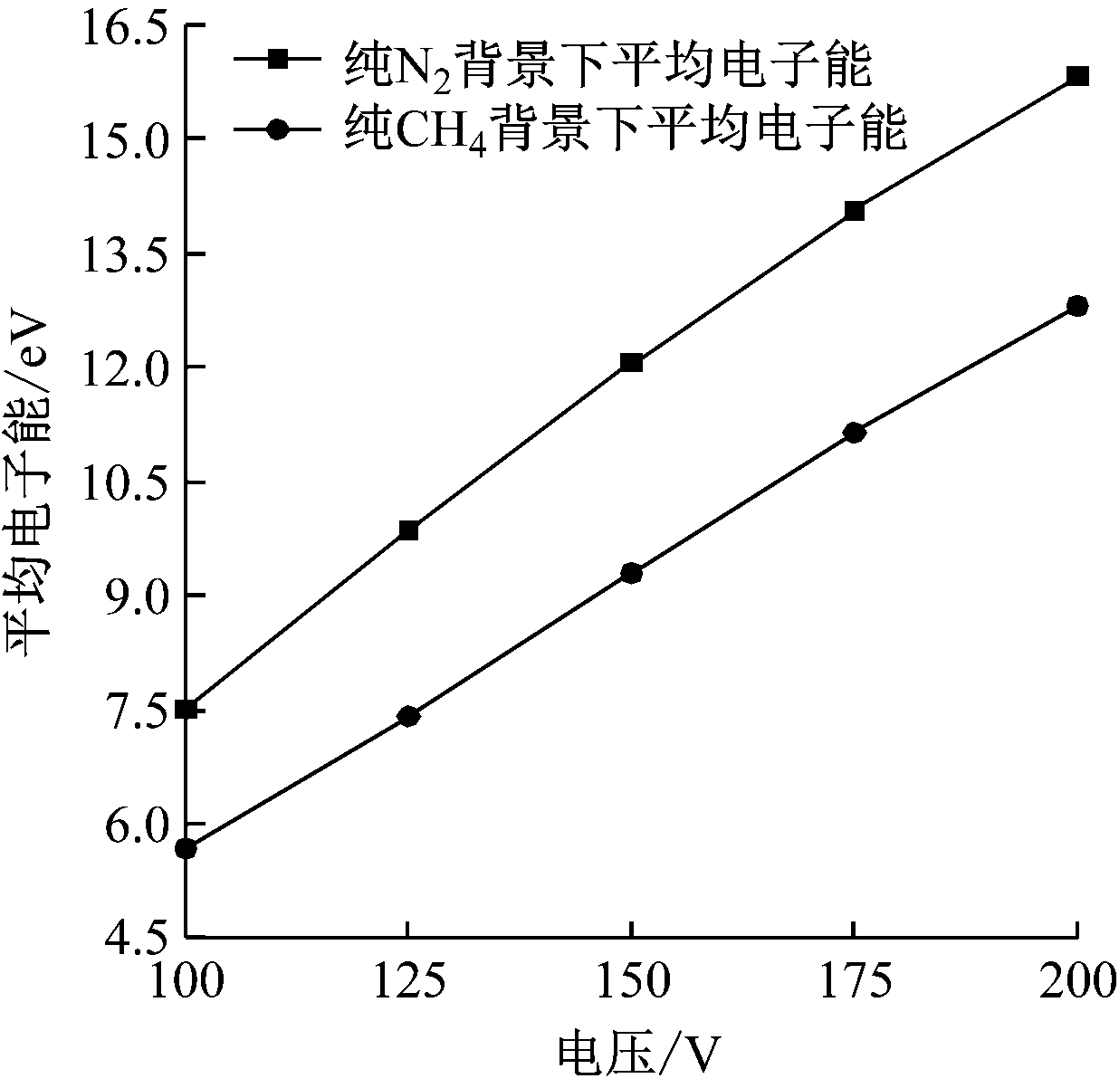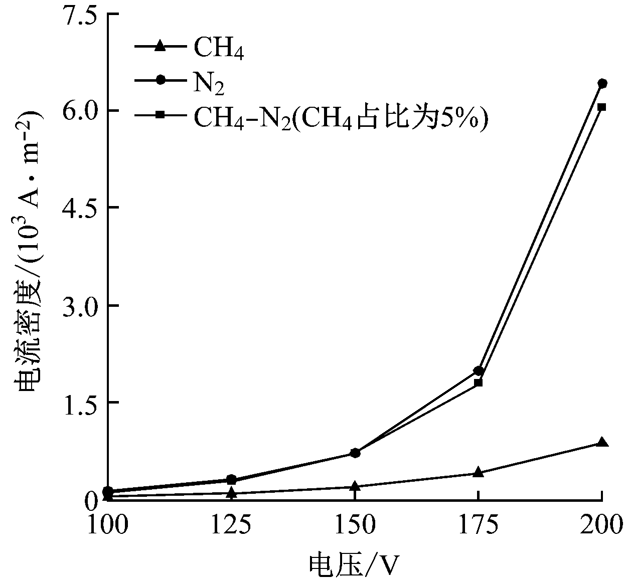 (2) CH4通过消耗N2的激发态降低彭宁电离反应速率,进而抑制了电流密度增长。