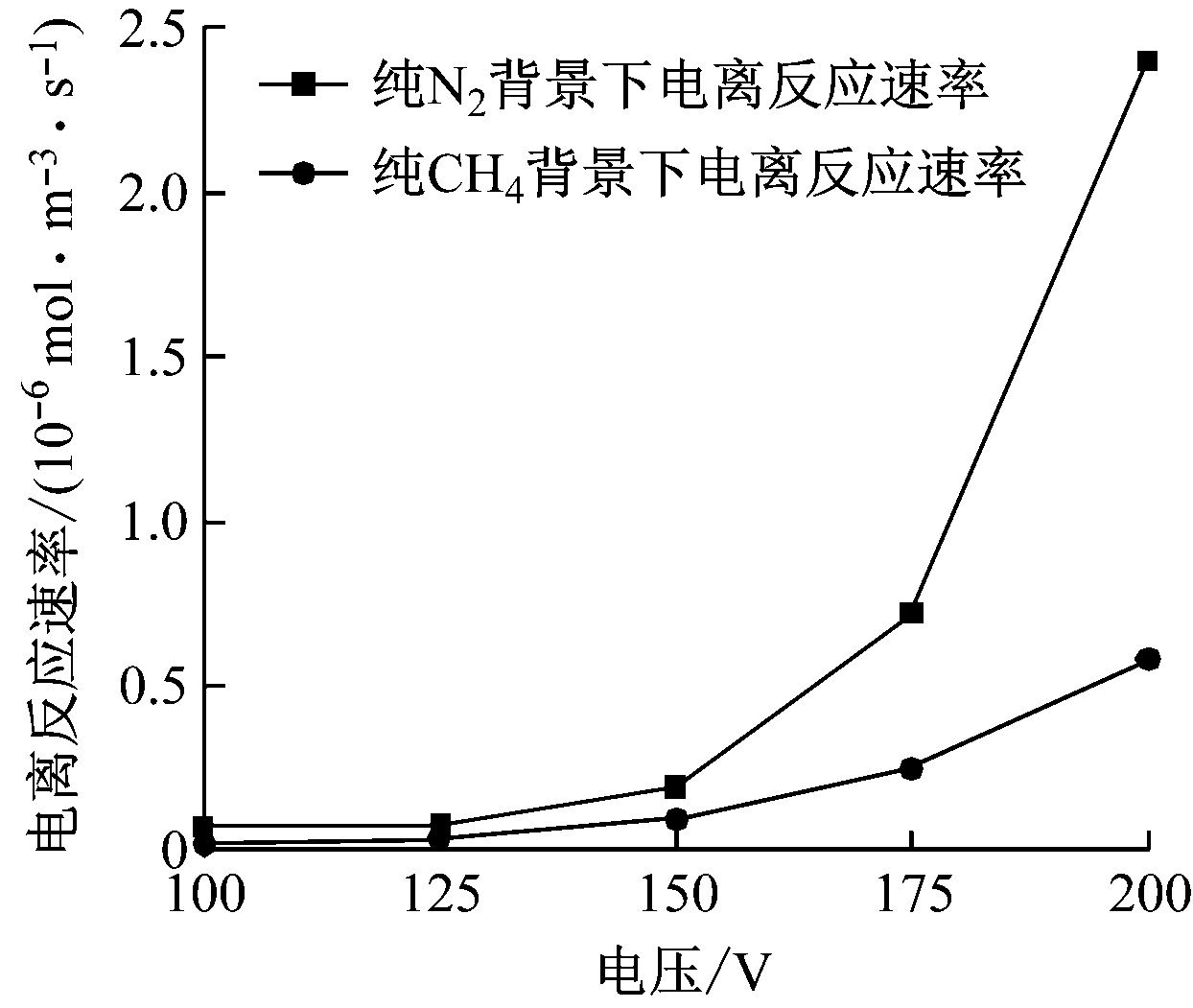 不同背景气体下平均电子能随电压的变化曲线如图5所示,电离反应速率随电压的变化曲线如图6所示。由图5、图6可以看出,在不同电压下,纯CH4中的平均电子能一直低于纯N2中的平均电子能,进而使得电离速率较小,放电过程较为微弱,即电流密度较小。因此,背景气体为纯CH4条件下的电流密度相比于背景气体为纯N2条件下的电流密度较为微弱,并且背景气体为纯N2条件下的正离子生成速率不仅来源于电子碰撞产生的电离反应,而且还依赖于N2的激发态之间的彭宁电离。
