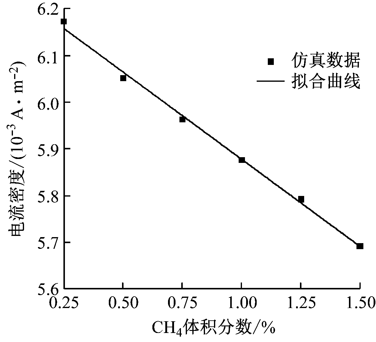 图7 电流密度随CH4体积分数占比的变化曲线