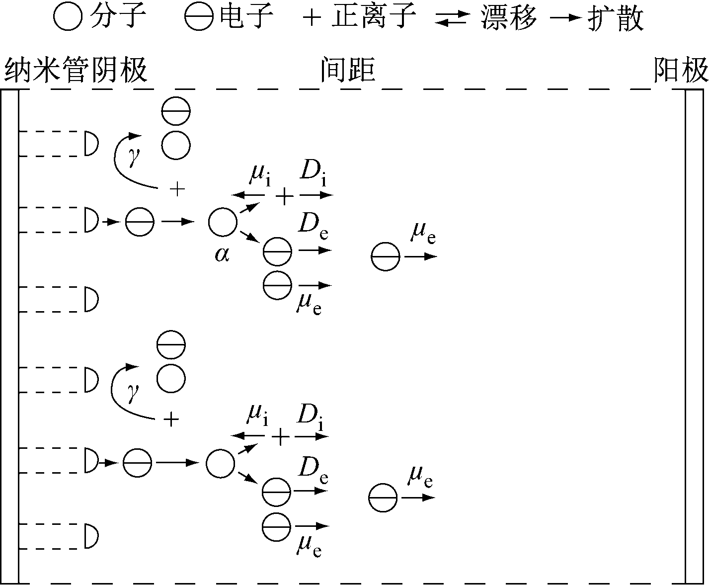 电离式气体传感器工作原理如图1所示。电离式气体传感器利用纳米管特有的尖端尺寸与长径比,在尖端附近产生较高的场增强因子,使电子在此区域内加速运动,从而获得能量去碰撞气体分子发生碰撞电离(α过程),电离出的电子在电场中获得能量从而继续碰撞电离,产生新的电子,产生的电子在电场的作用下定向移动(漂移过程)形成放电电流。电离反应产生的正离子会在电场中获得能量并不断轰击纳米管表面产生二次电子发射(γ过程),不断为电离反应提供种子电子,从而使放电过程得以维持[15]。图1中μi与μe分别为离子和电子迁移率,Di与De分别为离子和电子的扩散率,α为电离系数,γ为二次电子发射系数。