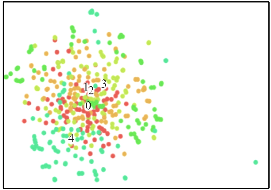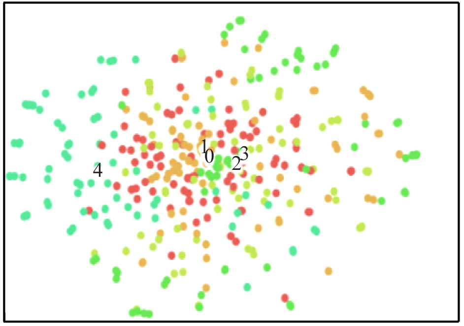 为了更加清晰地体现ResNet模型中每一层特征的输出分类状况,采用t-SNE技术[18]对ResNet模型的最大池化层、预激活残差单元模块和全连接层输出的高维特征进行降维和可视化,可视化效果如图11所示,其中不同的颜色代表不同的齿轮状态,数字与类型标签相对应。