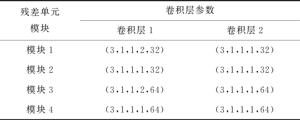 残差单元模块卷积层参数卷积层1卷积层2模块1(3,1,1,2,32)(3,1,1,1,32)模块2(3,1,1,1,32)(3,1,1,1,32)模块3(3,1,1,2,64)(3,1,1,1,64)模块4(3,1,1,1,64)(3,1,1,1,64)