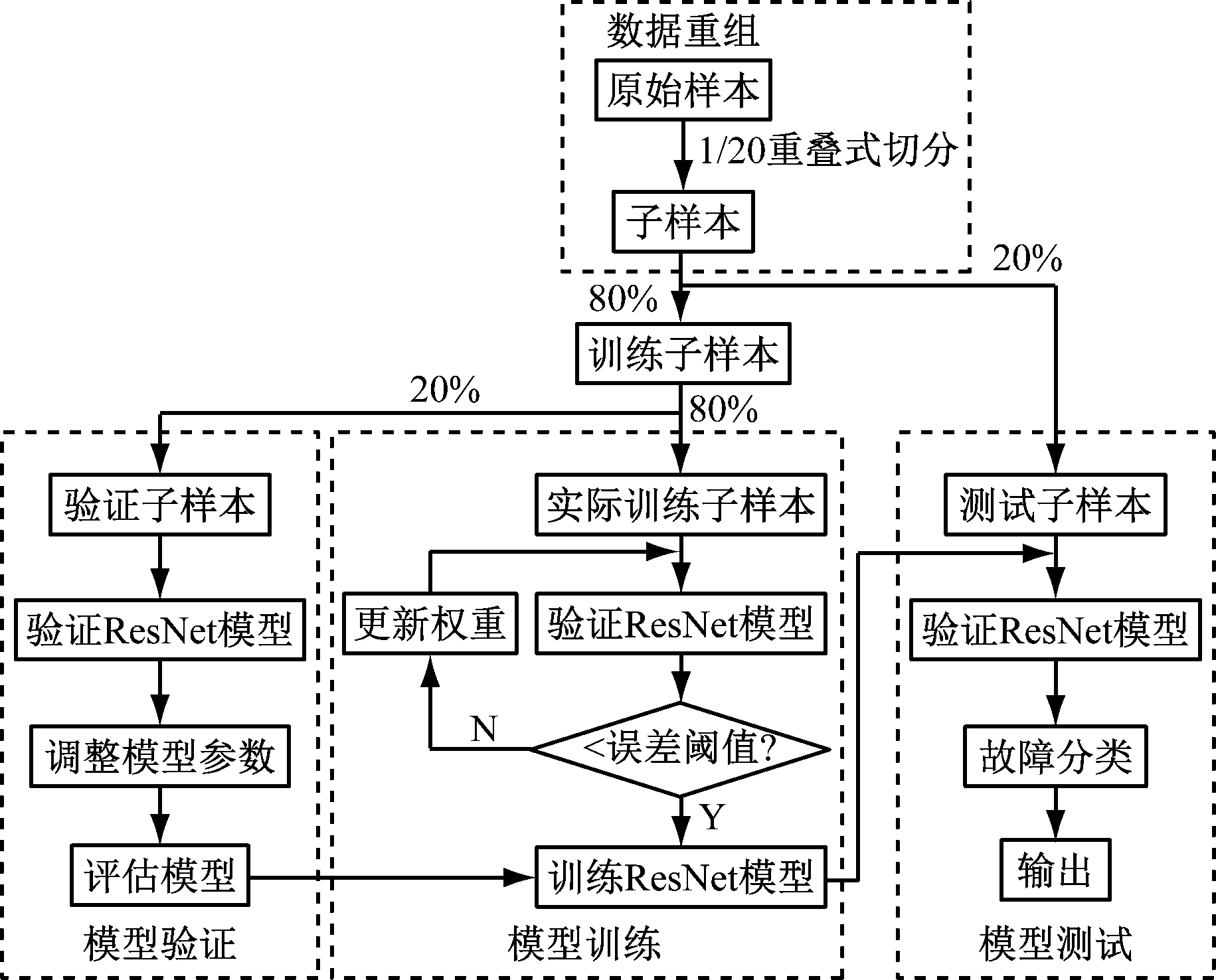 基于ResNet的故障诊断算法由数据重组、模型训练、模型验证和模型测试4个部分组成,具体流程如图4所示。首先对原始样本进行数据重组,然后将重组后的子样本按8∶2的比例划分为训练子样本和测试子样本,最后将训练子样本按4∶1的比例划分为实际训练子样本和验证子样本。