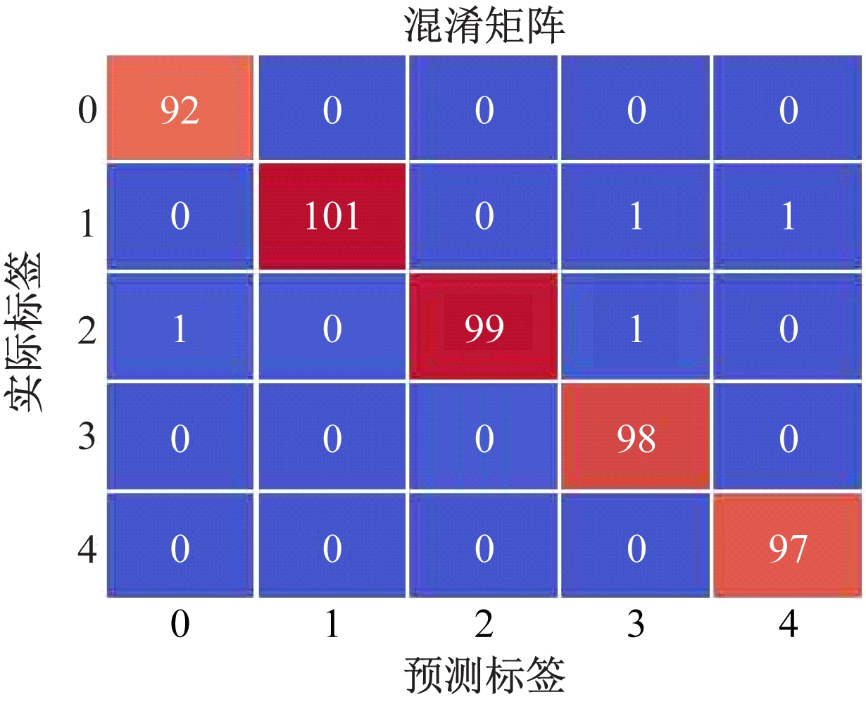 (2) 对测试集的混淆矩阵进行可视化分析,结果如下:有1个样本被误测为齿轮裂纹,有1个样本被误测为齿轮断齿;在齿轮点蚀测试样本中,有1个样本被误测为齿轮正常,有1个样本被误测为齿轮裂纹。其余3种齿轮状态的测试样本识别率均为100%。这表明ResNet模型能够很好地实现采煤机摇臂齿轮故障分类。
