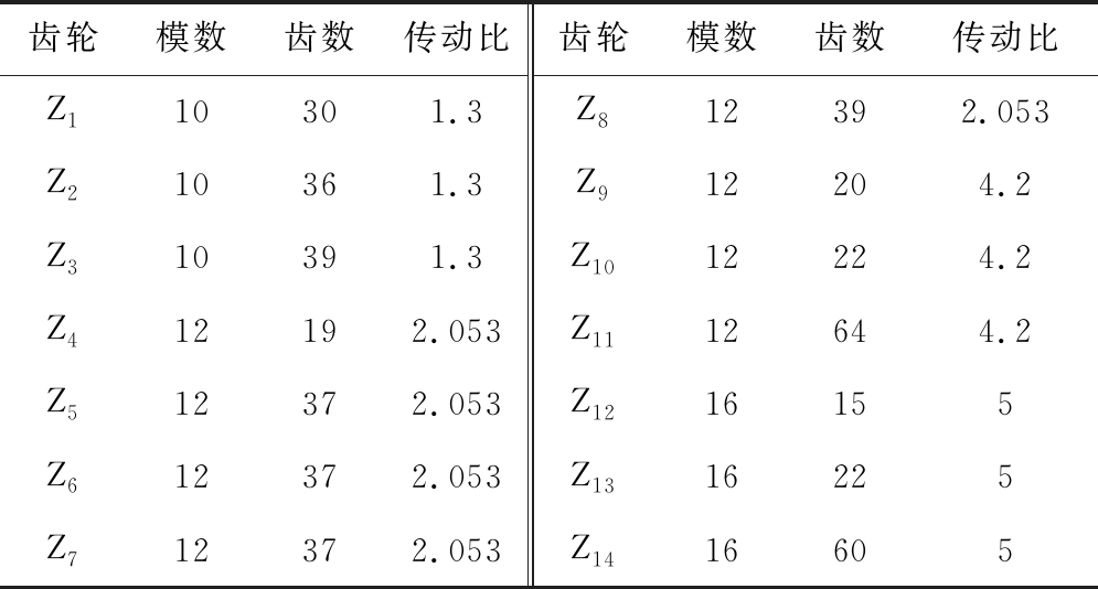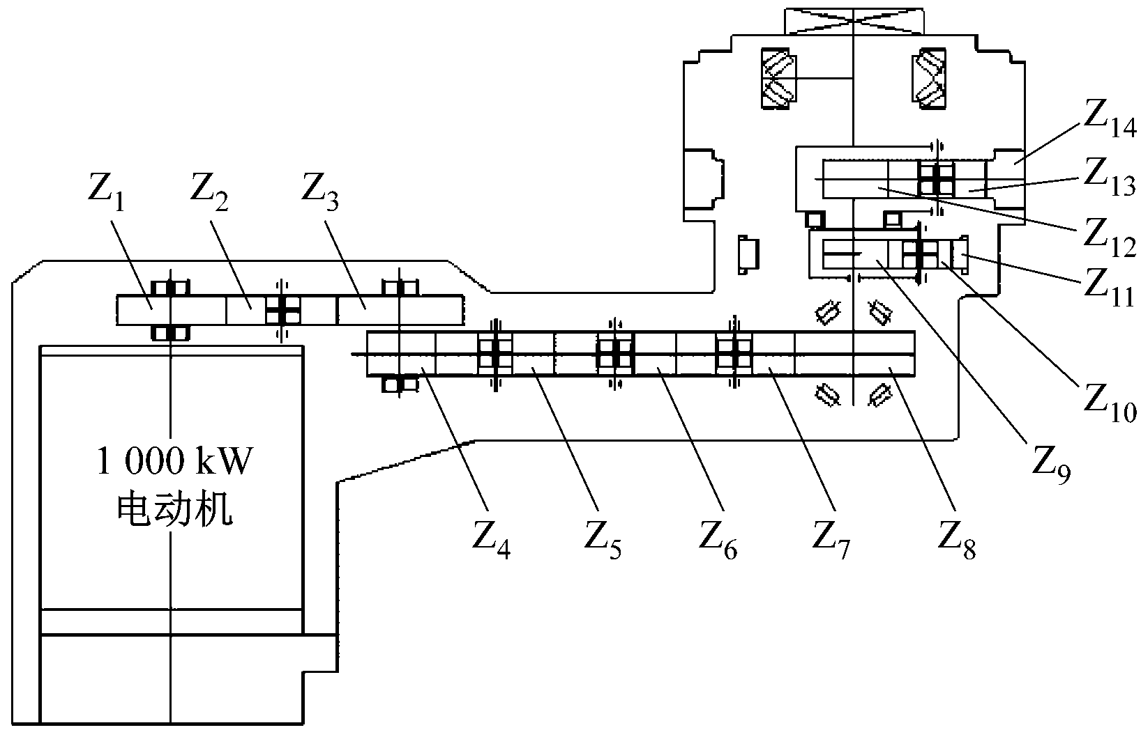 测试摇臂传动原理如图6所示,Z1—Z14为齿轮。截割部电动机的输出轴通过细长柔性扭矩轴与齿轮Z1相连,电动机输出转矩通过齿轮Z1—Z8传到第1级行星减速器,第1级行星减速器的行星架将动力传给第2级行星减速器,第2级行星减速器输出的动力传给方形联接套,最后传到截割滚筒。测试摇臂传动齿轮参数见表2。