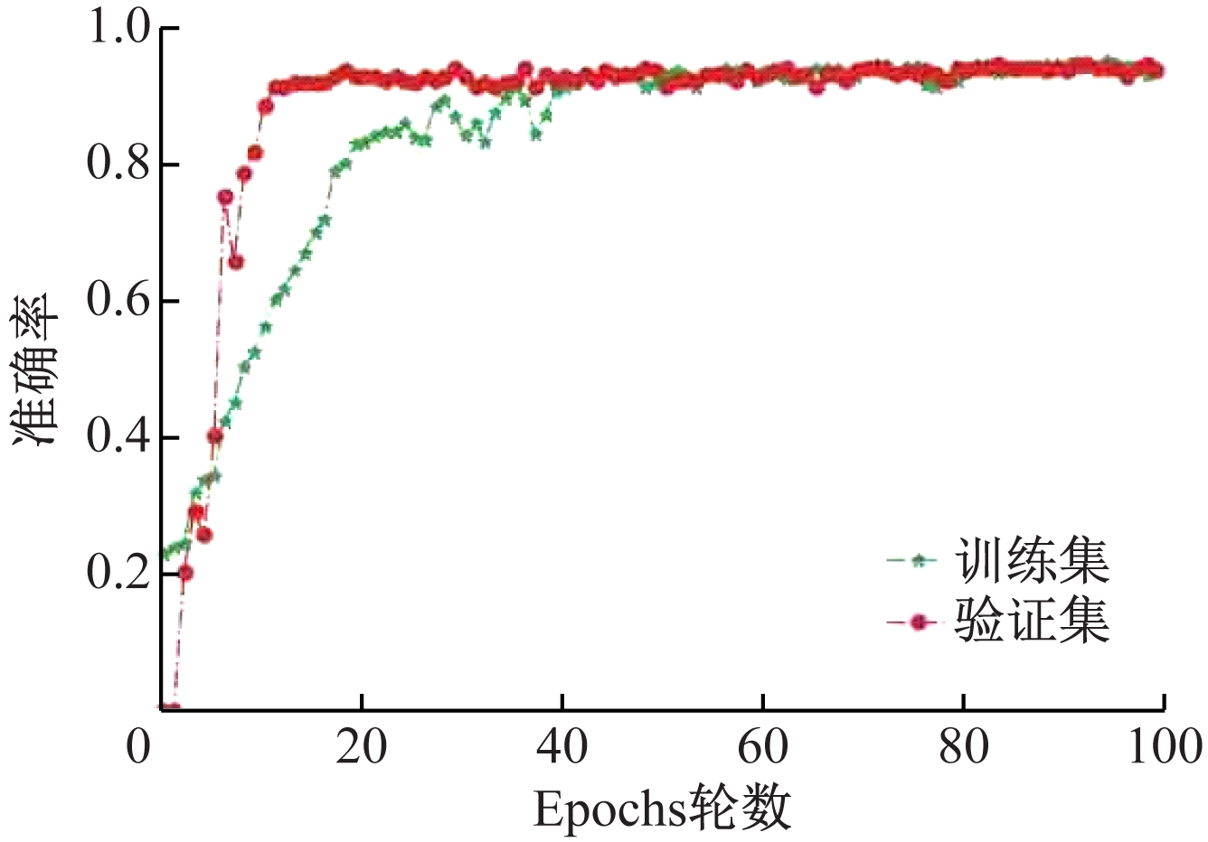 在训练100轮后,模型训练集和验证集的准确率如图9所示。从图9可看出,在前50轮Epochs,验证集的准确率比训练集收敛得快。在后50轮Epochs,验证集和训练集的准确率都接近于1.0。这表明构建的ResNet模型在训练集上的自主学习能力随着Epochs轮数的增加而逐渐增强。