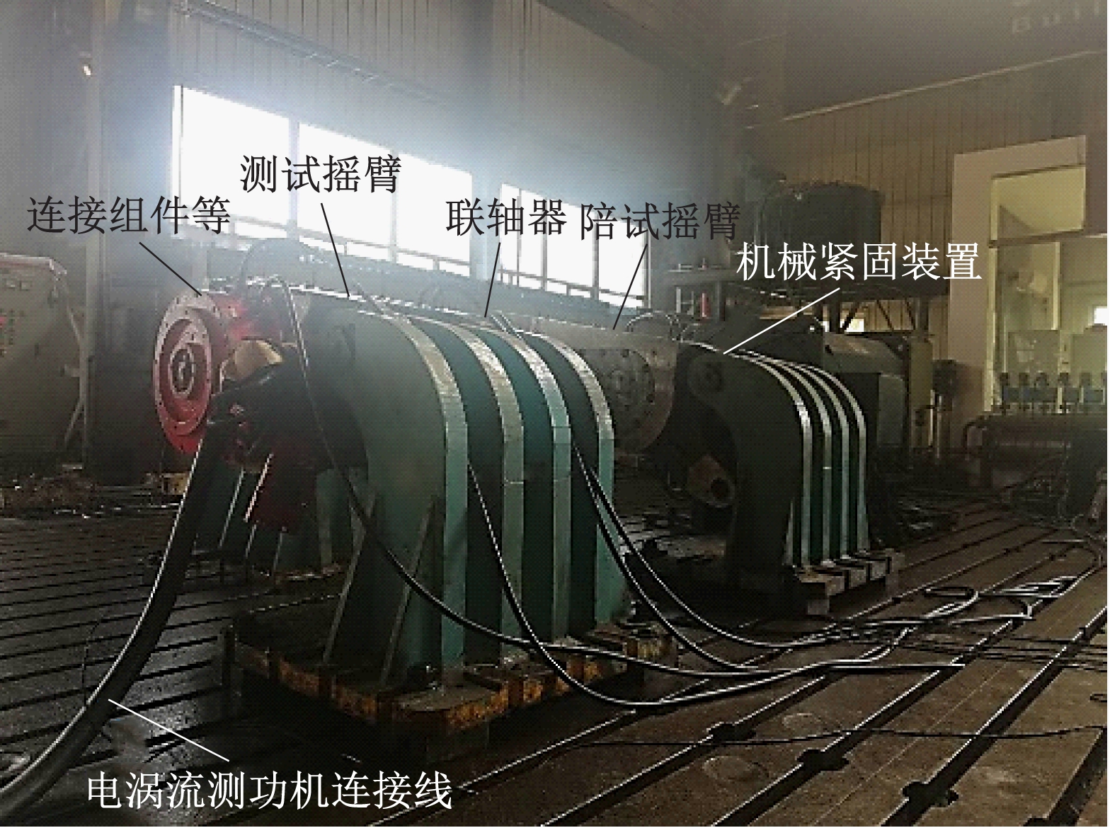(1) 将加载的双摇臂固定在支架上,通过连接组件将陪试摇臂的输出端和电涡流测功机的输入端连接固定,通过联轴器将陪试摇臂的输入端和测试摇臂的输出端连接固定,并进行适当调节,使连接固定的各部件回转中心尽量保持一致,防止摇臂产生振动。