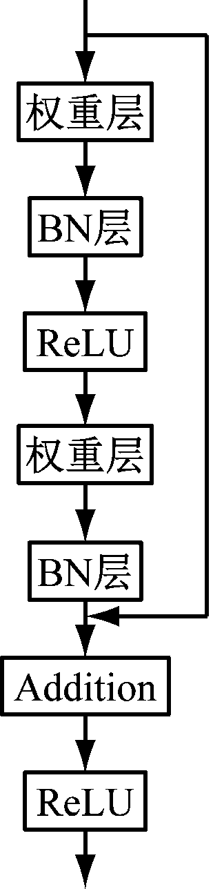 残差单元模块主要通过“捷径连接”的方式,直接把输入X传到输出作为初始结果,输出H(X)=F(X)+X,当F(X)=0时,H(X)=X,即图1中的恒等映射。残差单元模块改变了学习目标,不需要学习完整的输出,只需学习输入和输出之间有差别的部分,即残差F(X)=H(X)-X。其训练目标是将残差F(X)逼近于0,使得ResNet的准确率不再随着深度的不断加大而下降。残差单元模块的跳跃式结构改变了传统的神经网络某一层的输出只能作为其下一层输入的惯例,使某一层的输出可以直接跨越多层作为后面某一层的输入,为网络层数增加引发模型精确度下降的难题提供了新的解决思路。深度残差单元主要通过以下公式来执行: