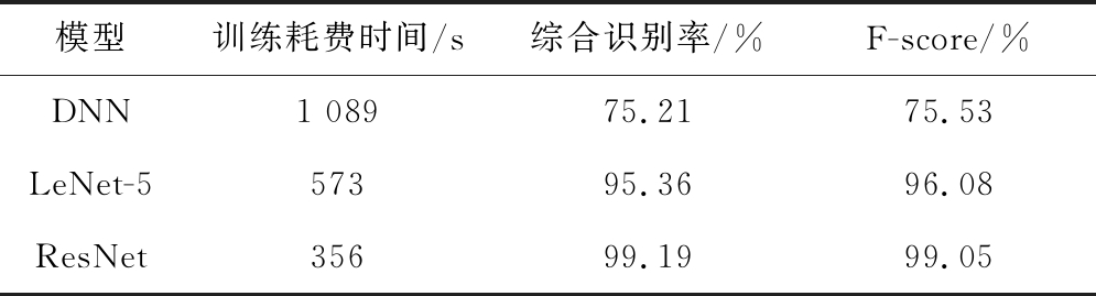 DNN模型表现最差,其综合识别率和F-score都在80%以下,其中F-score仅为75.53%,说明模型的稳定性较差。LeNet-5的综合识别率和F-score分别为95.36%和96.08%,均高于DNN模型。与LeNet-5相比,ResNet模型的综合识别率提高了4%左右,F-score提高了3%左右。综上所述,ResNet模型的分类效果更加显著,且稳定性更好。