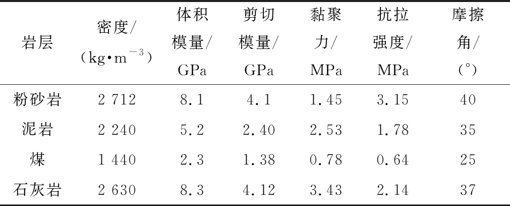 岩层密度/(kg·m-3)体积模量/GPa剪切模量/GPa黏聚力/MPa抗拉强度/MPa摩擦角/(°)粉砂岩2 7128.14.11.453.1540泥岩2 2405.22.402.531.7835煤1 4402.31.380.780.6425石灰岩2 6308.34.123.432.1437