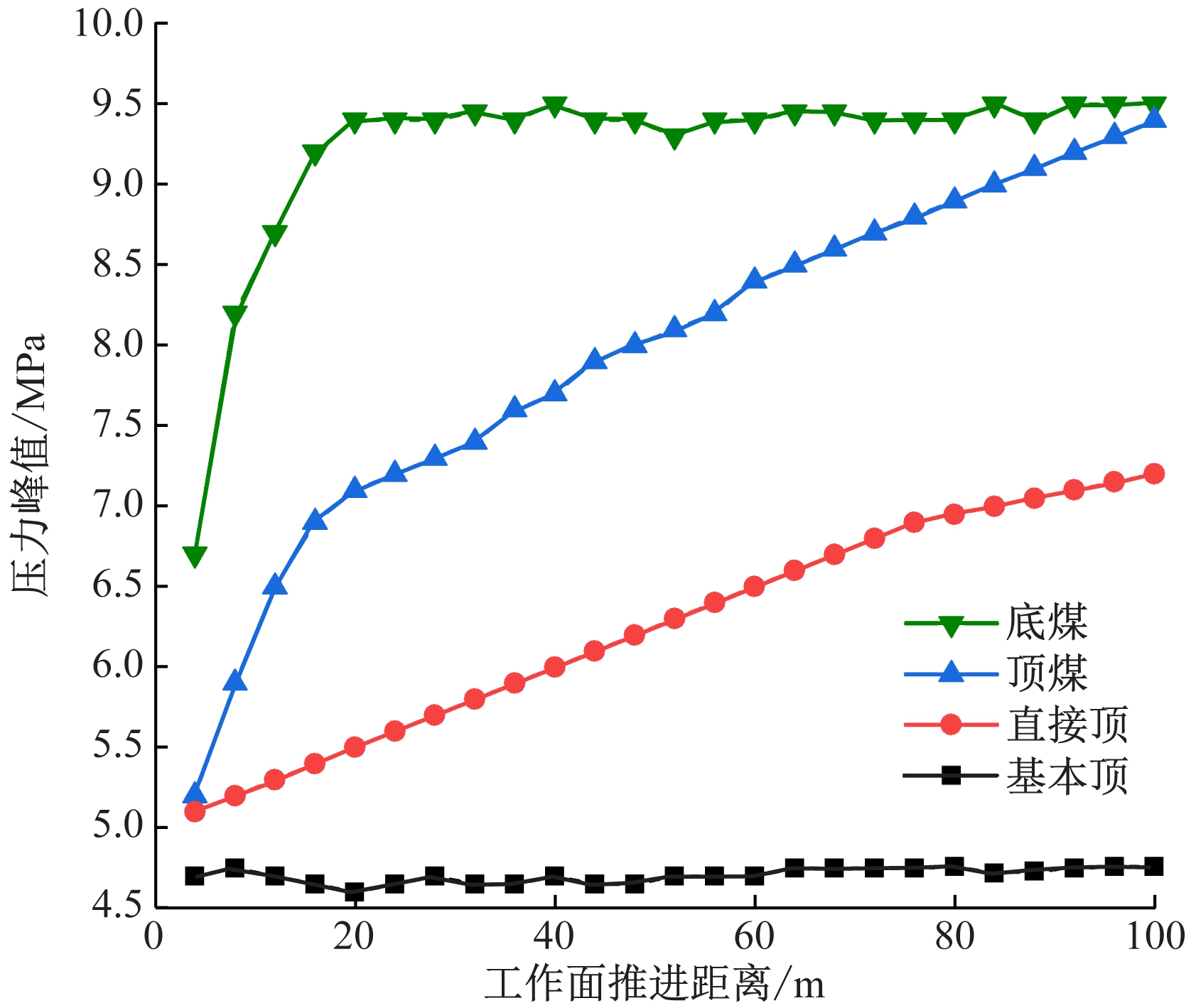 不同层位支承压力峰值及峰值点位置随工作面推进变化曲线如图2所示。由图2可看出,随工作面推进,底煤在工作面推进前20 m过程中压力峰值变化最大,顶煤变化幅度次之,直接顶压力峰值变化均匀,说明顶煤为垮落带,受采动影响较大,直接顶大部分为断裂带,应力峰值随着工作面推进距离的增加而逐渐增大。基本顶支承压力峰值受工作面推进影响不大,且基本顶远离采空区,说明基本顶已过渡为弯曲下沉带,底煤是综放仰采工作面应力最为集中的区域。