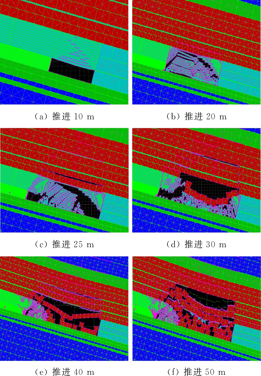 从图4可看出:当工作面推进10 m时,顶煤裂隙发育但未出现垮落,工作面推进20 m时,顶煤发生垮落,直接顶产生离层并向上发展。随着工作面的推进,垮落带逐渐升高,垮落范围也是随之增大,垮落角度为75° 左右。当工作面推进至25 m时,直接顶岩层发生垮落,基本顶石灰岩与煤层交界面发生离层。工作面推进至30 m时,直接顶岩层整体离层发生垮落,垮落高度为4.5 m,工作面继续推进,上覆岩层垮落高度增加,垮落范围增大。当工作面推进至40 m时,直接顶岩层已全部垮落触底,基本顶石灰岩断裂,形成初次来压。当工作面推进至50 m时,基本顶出现第1次周期性的断裂,即为工作面第1次周期来压,以后工作面每推进10~15 m,基本顶就会发生周期性断裂,即基本顶的周期来压步距为10~15 m。