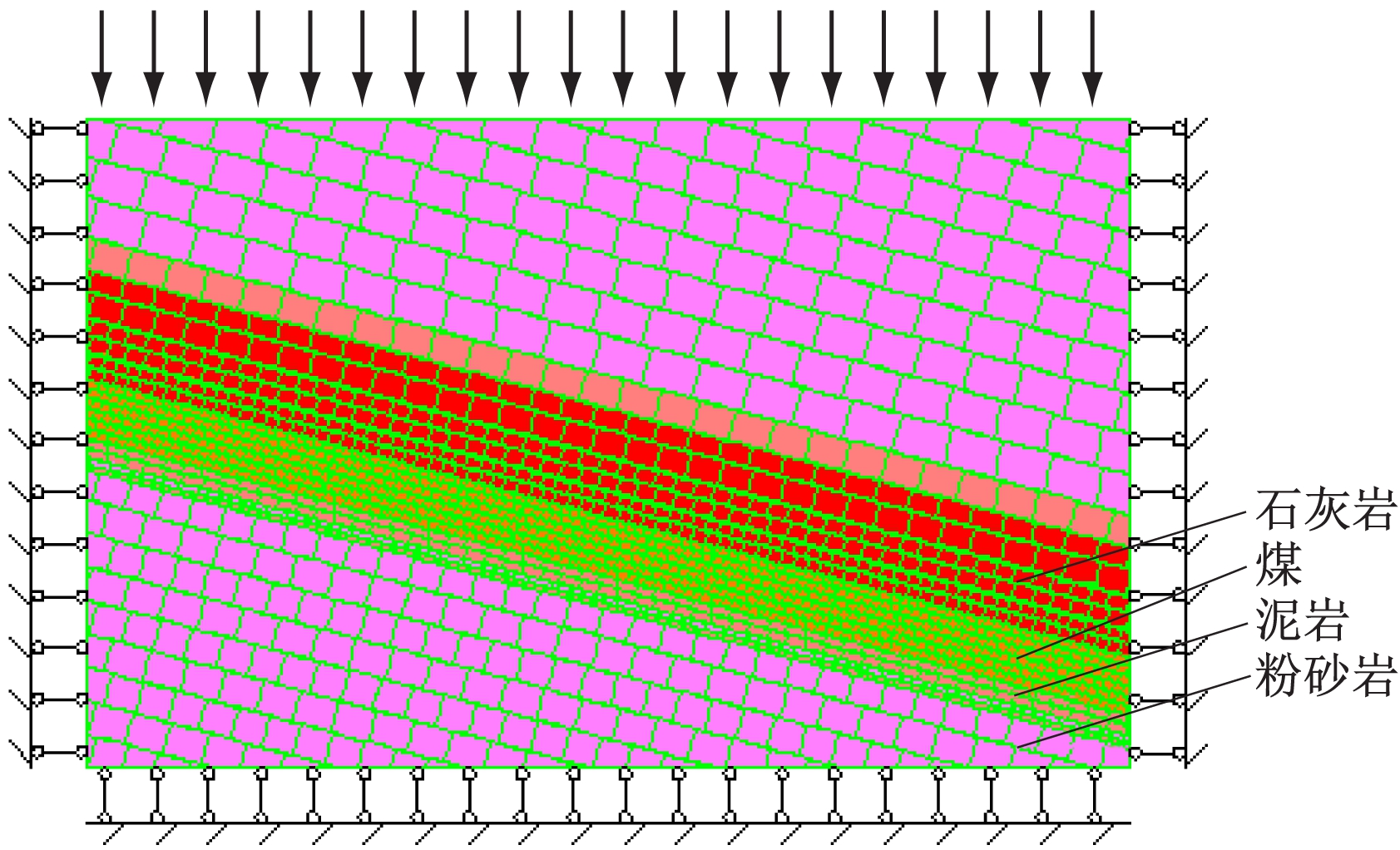 以8102工作面地质和开采技术条件为背景,考虑边界效应,采用平面应变模型,模型长度为160 m,高度为100 m,上部加均匀载荷,采高为9 m。模型共有块体3 354个,采用四边形单元划分,划分后共有5 304个单元,11 833个接触面。模型包含4个边界,上边界为应力边界,施加5.0 MPa的正压力(上边界距地表200 m),取重力加速度g为9.8 m/s2。模型的左右边界及下部边界为位移边界,左右边界限制水平位移,下部边界限制垂直位移,采用Mohr-Coulomb本构模型进行计算。建立的数值模型如图1所示,煤岩体的力学参数指标见表1。