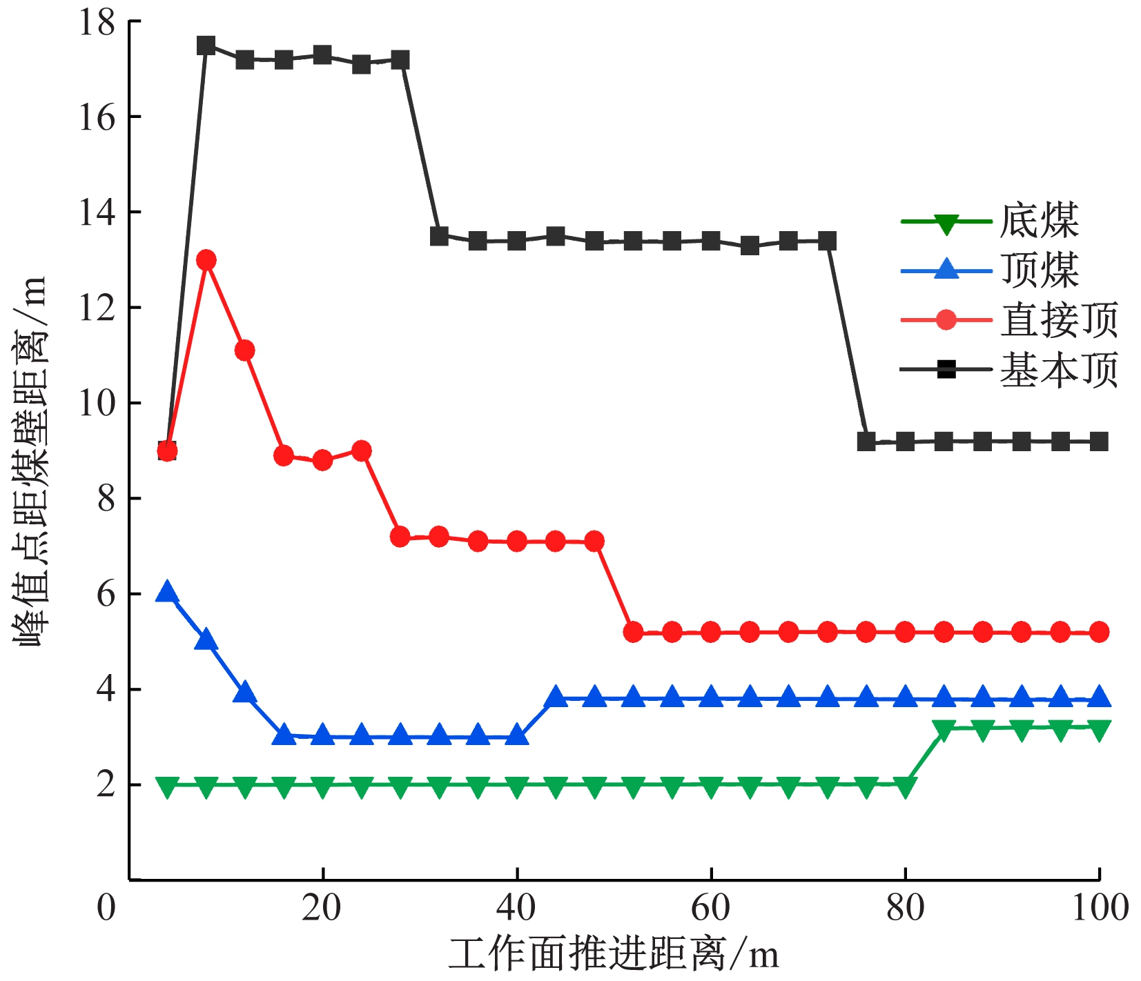 不同层位支承压力峰值及位置变化曲线如图3所示。由图3可看出,煤层内支承压力峰值点距煤壁最近,且底煤内支承压力峰值点随工作面推进逐渐远离煤壁,顶煤内支承压力峰值点在工作面推进16 m过程中距煤壁距离由6 m下降为3 m,在继续推进至40 m过程中稳定于煤壁前3 m,随工作面继续推进,峰值点稳定于煤壁前方4 m;直接顶、基本顶内支承压力峰值随工作面推进先增后减,直接顶内支承压力峰值点距煤壁5~13 m,基本顶内支承压力峰值点距煤壁9~18 m。直接顶、基本顶内支承压力峰值点随工作面推进逐渐靠近煤壁,基本顶所受影响最大,这可能是因为煤岩体向采空区的垂直位移大于水平位移,基本顶刚度大,极限跨距大,直接顶、煤层相对较软,向采空区运移时基本顶受扰动更深入,支承压力峰值点距煤壁较远。