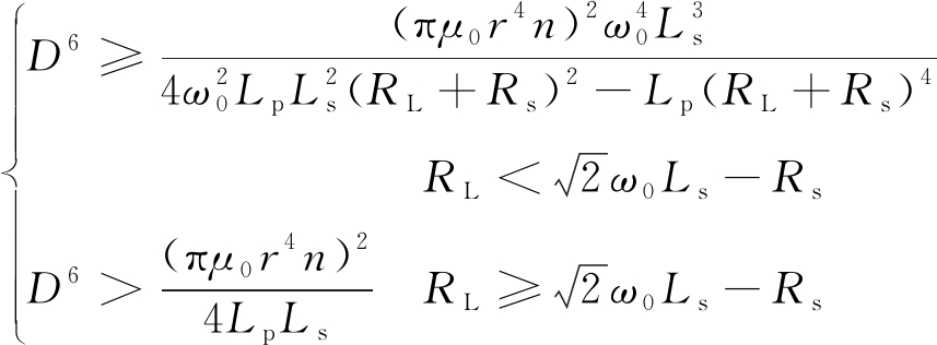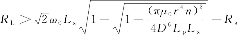 时,一定满足1>(πμ0r4n)2/(4D6LpLs),由此可得系统频率稳定性不受传输距离影响下的负载电阻范围: