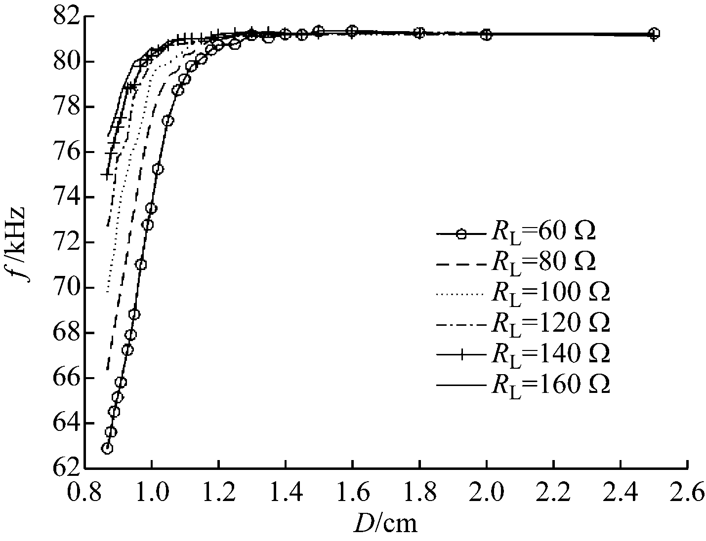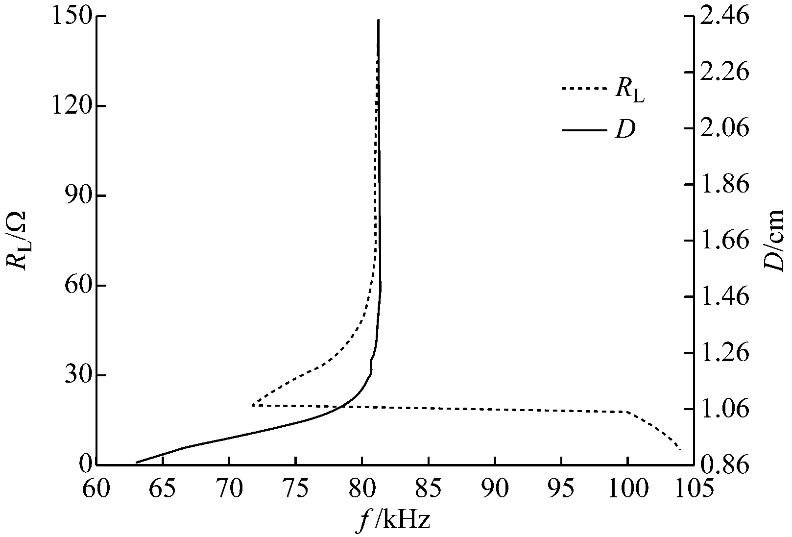 系统传输距离D固定(D=1.07 cm)时,自然振荡频率f随负载电阻RL变化曲线如图3中虚线所示。可看出当RL>53 Ω(根据式(13)计算的理论临界值)时,系统自然振荡频率趋近预设谐振频率81.378 kHz;当RL<53 Ω时,系统自然振荡频率衰减加剧,在RL=20 Ω时发生频率分叉现象,自然振荡频率出现跃变。系统负载电阻RL固定(RL=60 Ω)时,自然振荡频率随传输距离D变化曲线如图3中实线所示。可看出当D>0.96 cm(根据式(14)计算的理论临界值)时,系统自然振荡频率趋近预设谐振频率81.378 kHz;当D<0.96 cm时,系统自然振荡频率的衰减趋势随着传输距离的减小而加剧。